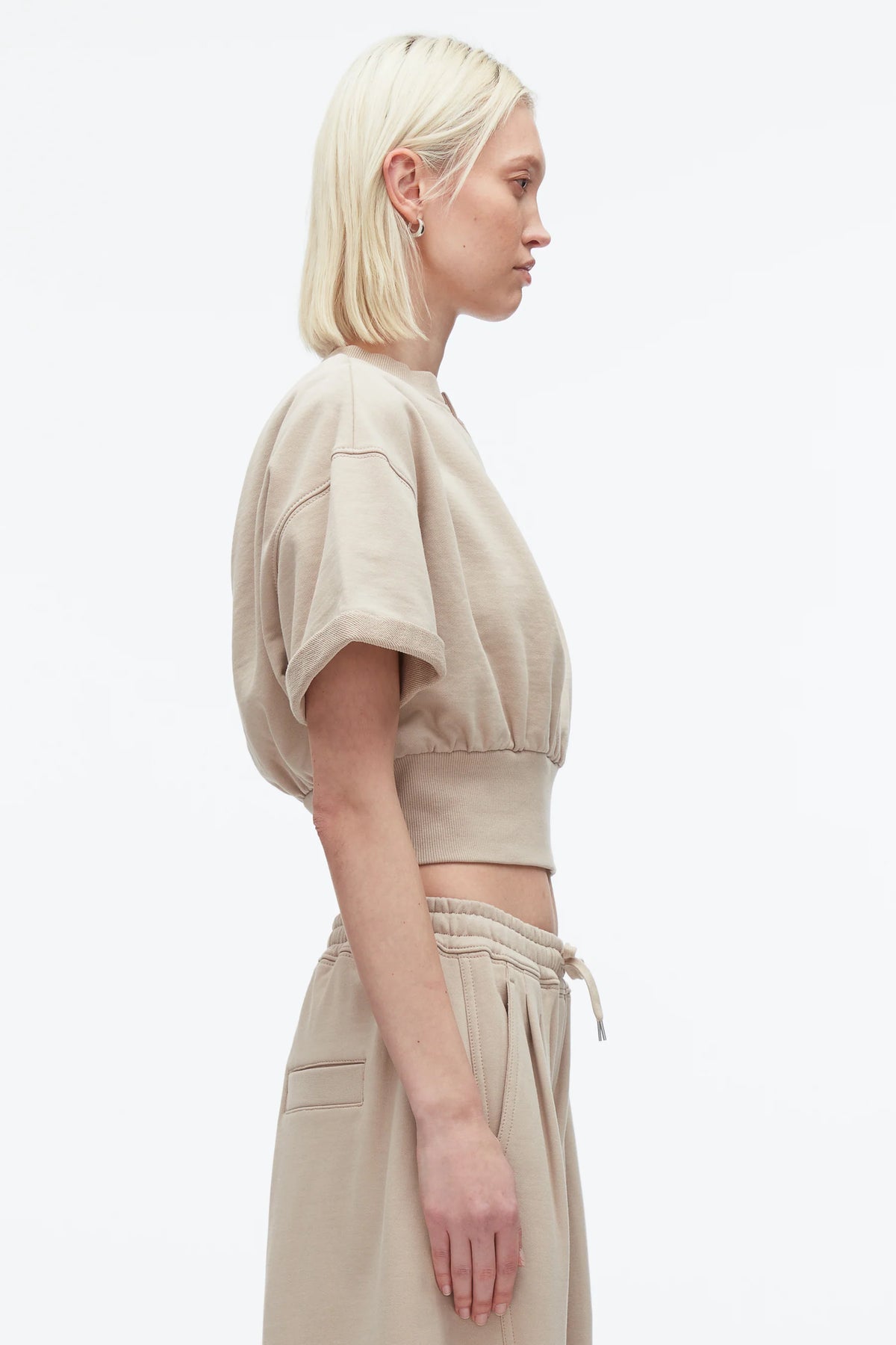 سويت شيرتنا القصير الأكثر مبيعًا مصنوع من قطن عضوي من نوع فرينش تيري. اللعب بالأبعاد، حيث تم استخدام الأضلاع العريضة لتسليط الضوء على الخصر مع خلق تأثير مجمع برفق. تصميم مريح مع تفاصيل الأكمام المقلوبة.
