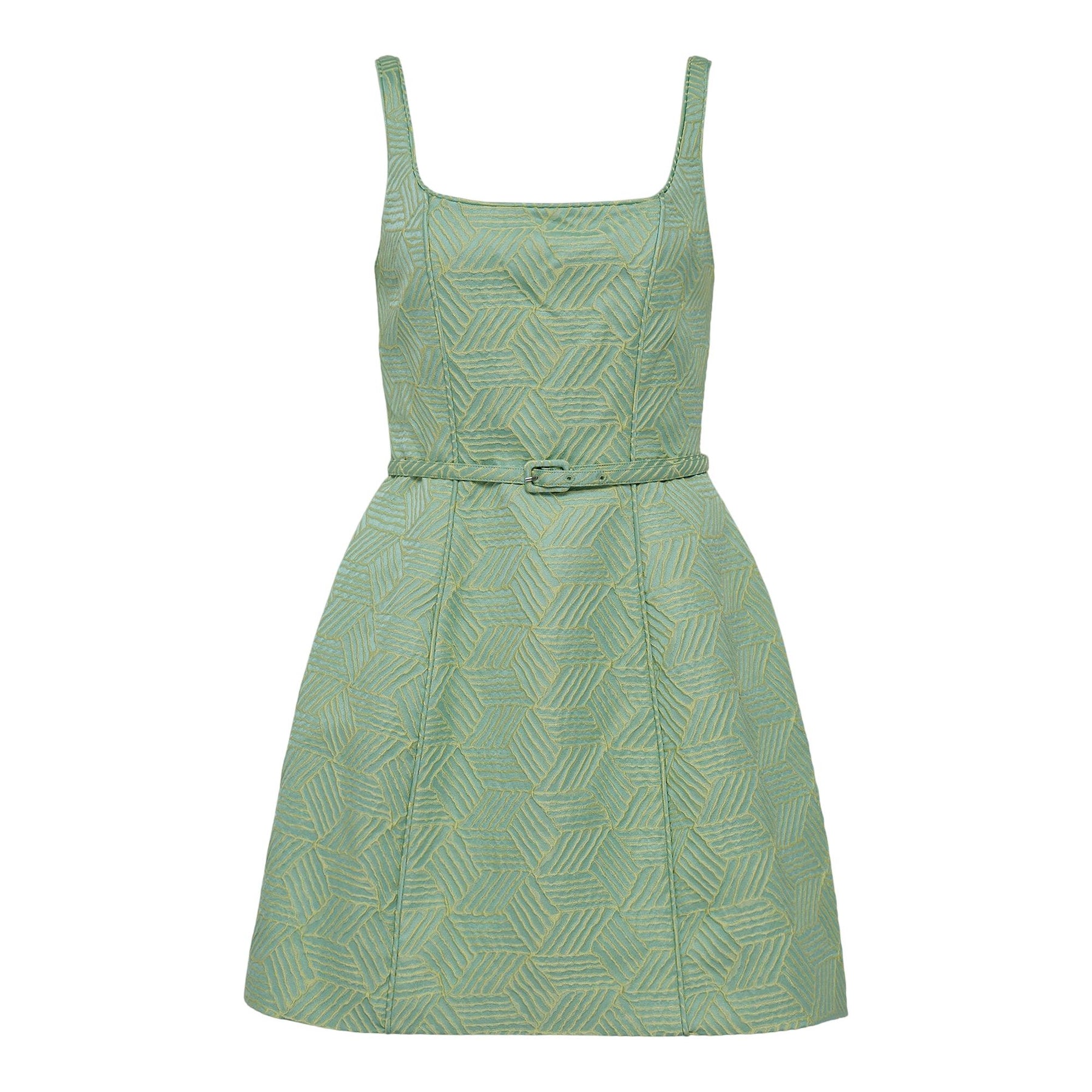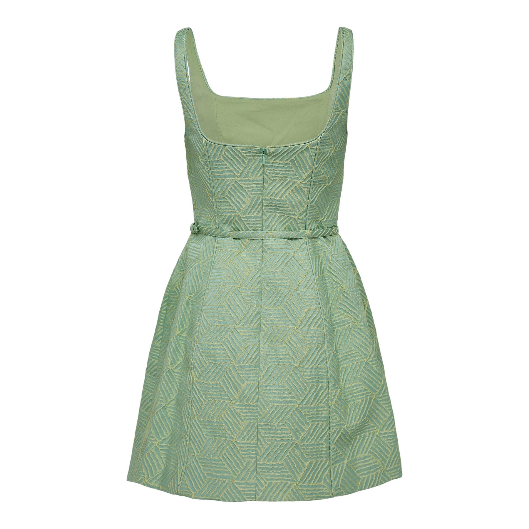 فستان بيجو هو فستان ميني من قماش جاكار ذو ملمس، يتميز بتفاصيل من حواف ملونة وحزام قابل للإزالة يحدد الخصر.
