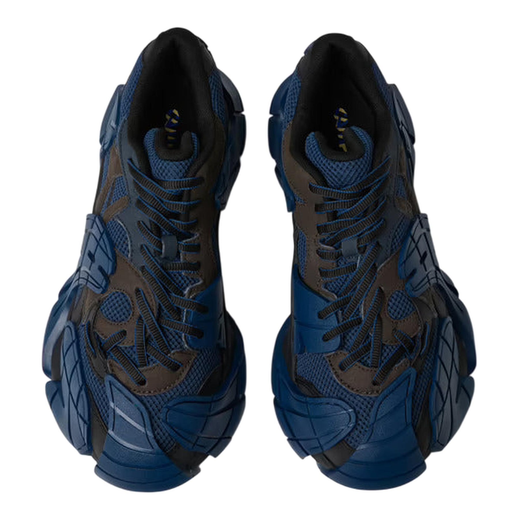 أحذية رياضية زرقاء وسوداء رمادية مع شبكة سورونا، وأعلى من هيبفا لايت وميروم، وأربطة تينسيل لايوسيل، ونعال أورثولايت المعاد تدويرها، ونعل خارجي من المطاط وإيفا.