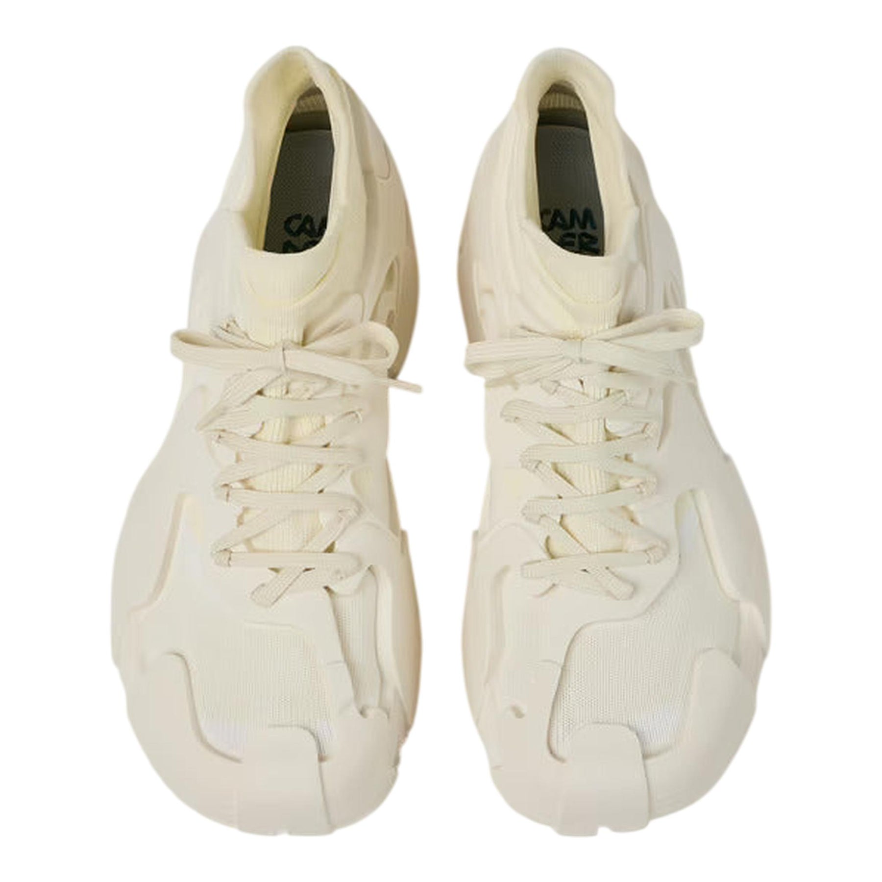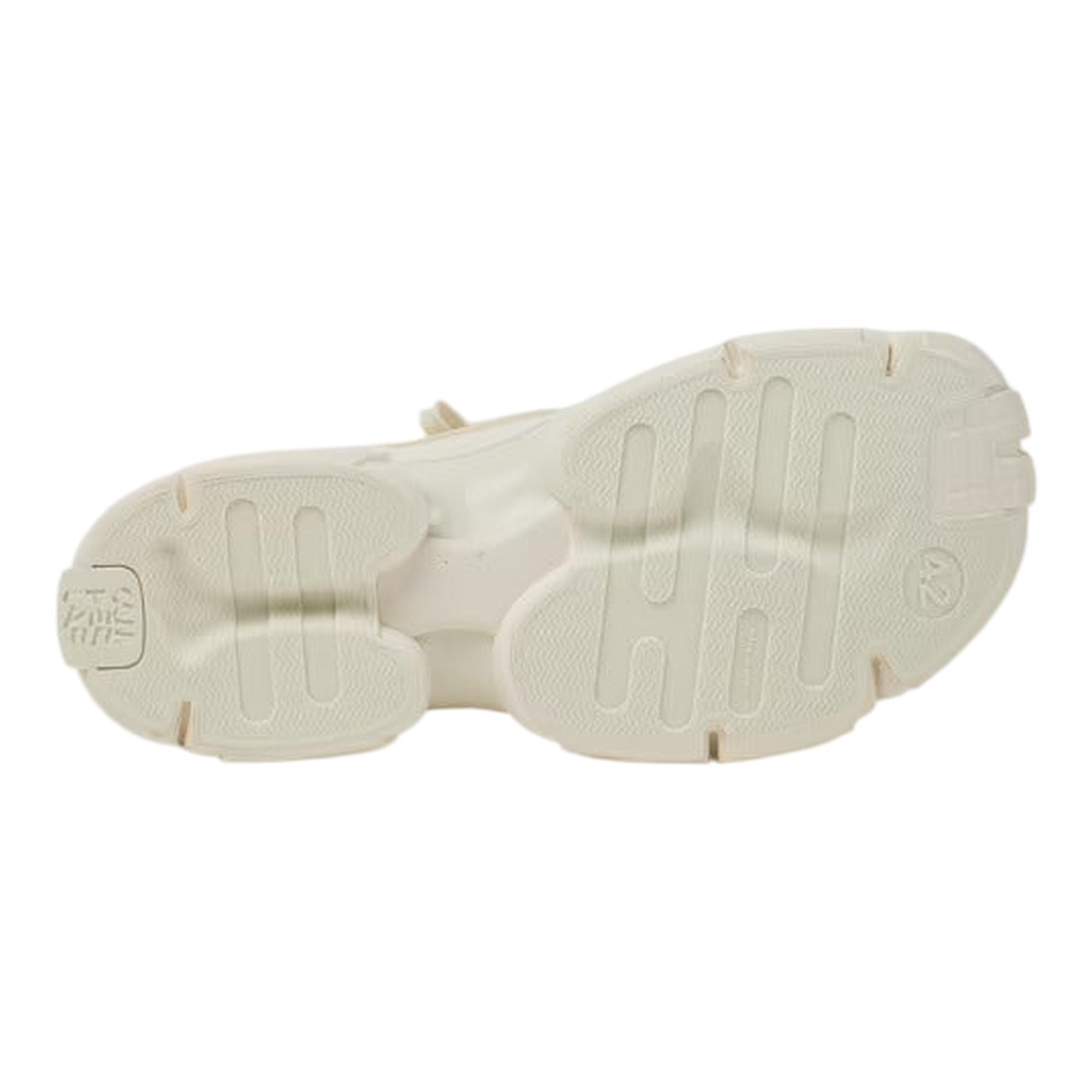 أحذية رياضية بيضاء محاطة بقفص مع بطانات داخلية مصنوعة من خيوط PET المعاد تدويرها المنسوجة بتقنية 3D المقاومة للماء، وأسطح خارجية مصنوعة من TPU بالحقن المباشر، ونعل خارجي مصنوع من PU المعاد تدويره. قابلة لإعادة التدوير بالكامل.