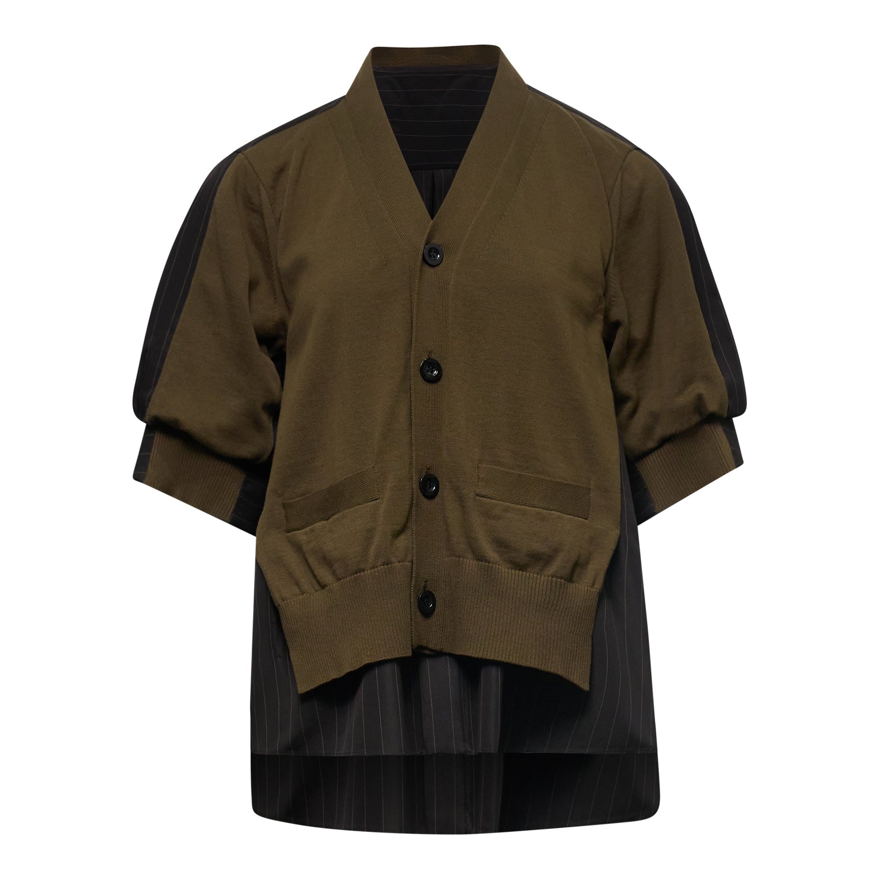 The sacai Chalk Stripe x Cotton Knit Cardigan delivers hybrid design innovation with the brand's signature layered aesthetic. Crafted from premium cotton knit in olive green with contrasting chalk stripe panel detailing that creates visual depth and textural interest. The deconstructed silhouette features sacai's signature layering technique that redefines traditional cardigan construction.