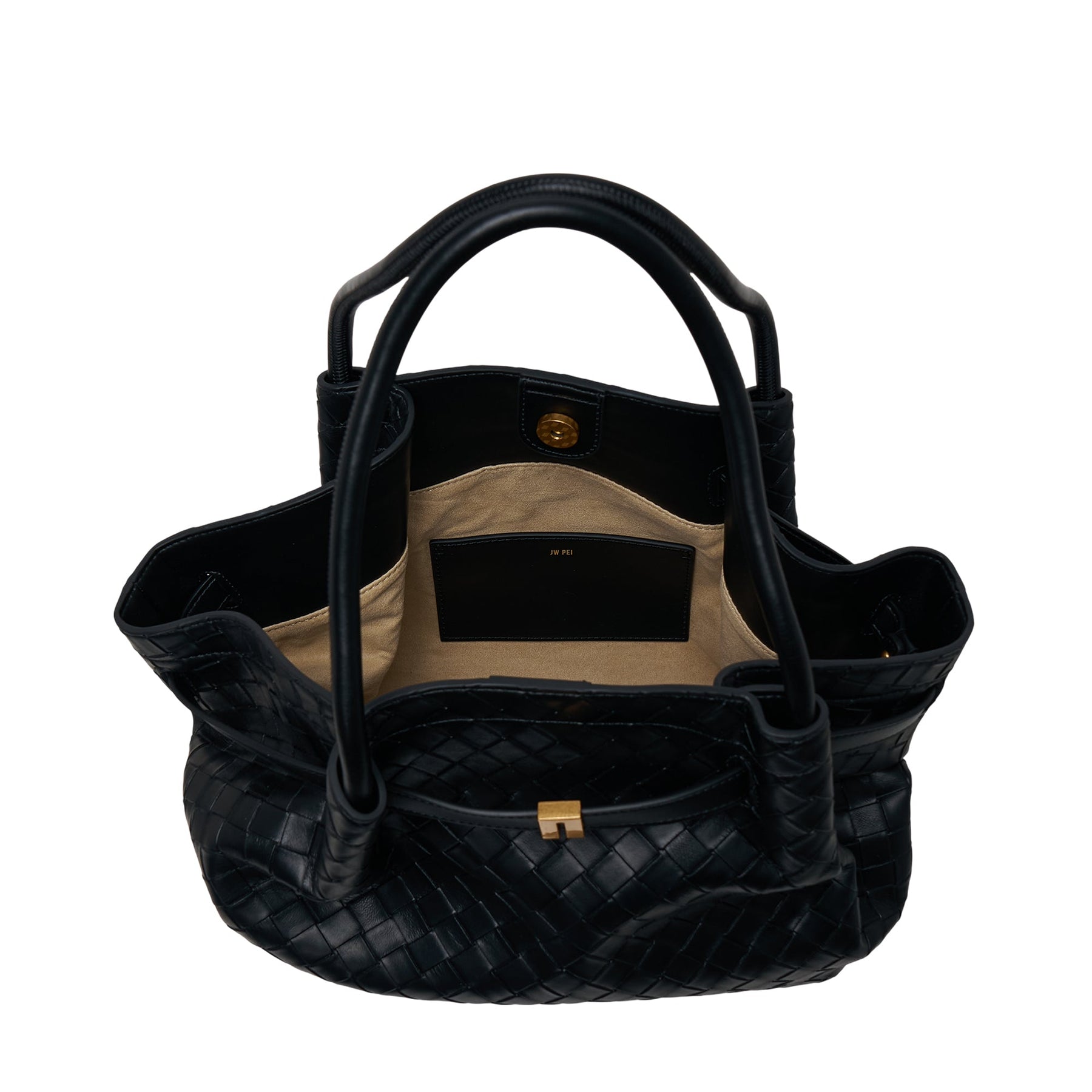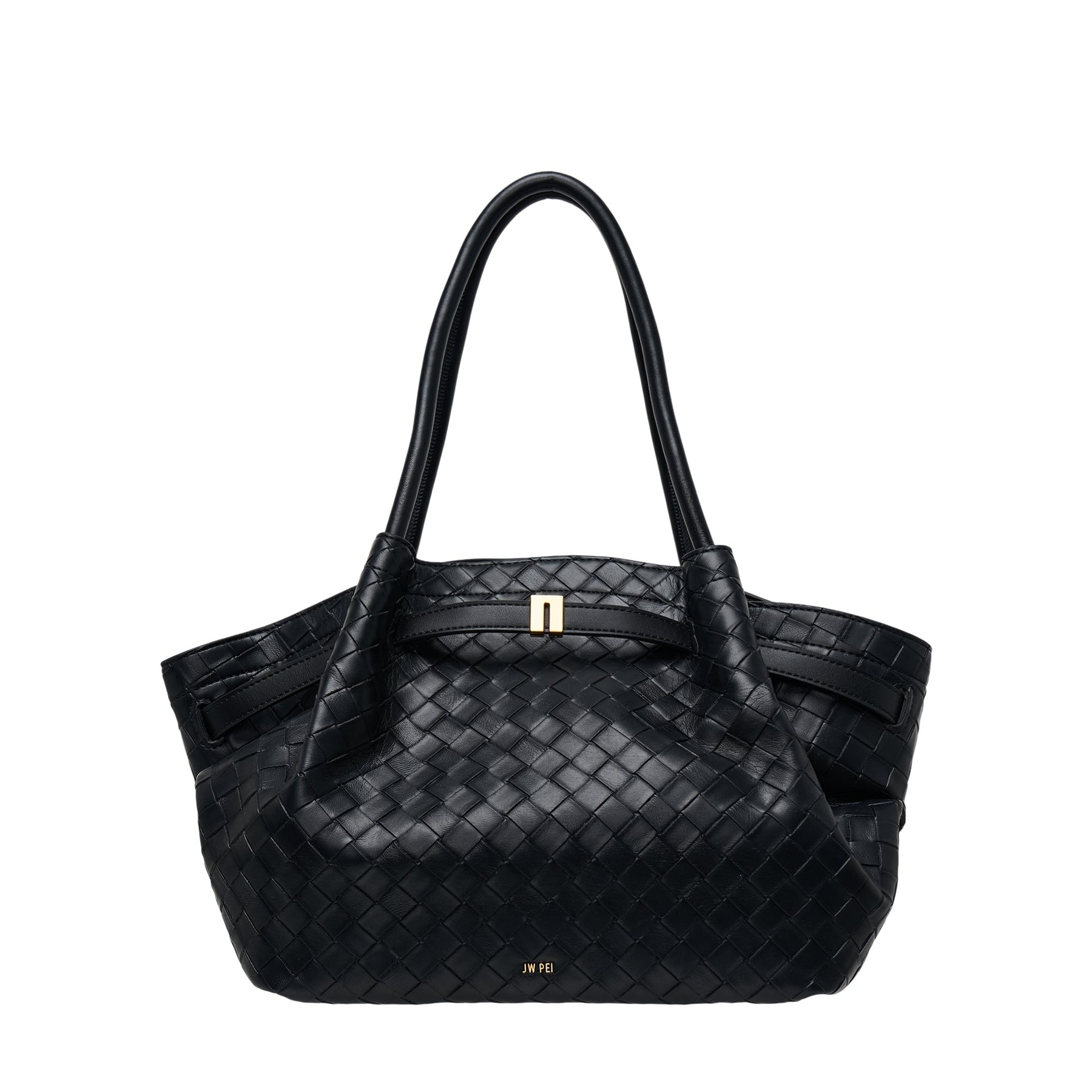 The JW PEI Hana Medium Weave Texture Tote delivers contemporary sophistication with distinctive interwoven leather construction. Crafted from premium vegan leather in classic black with signature basketweave texture, featuring structured handles and gold-tone hardware accents. The spacious interior and architectural silhouette create a versatile statement piece for modern lifestyles.