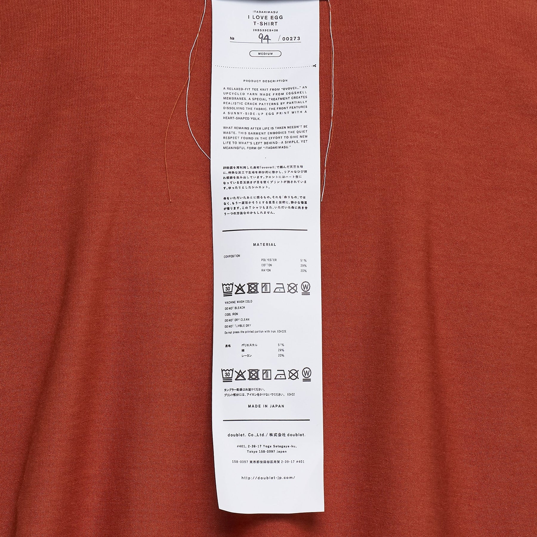 The doublet I Love Egg T-Shirt delivers playful Japanese streetwear with signature graphic design and contemporary appeal. Crafted from premium cotton in rich rust orange, featuring a whimsical heart-shaped fried egg print that showcases the brand's irreverent aesthetic. The bold graphic and oversized silhouette create a statement piece that embodies doublet's avant-garde approach to casual wear.