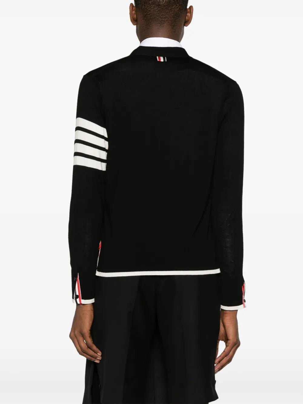 Thom Browne Jersey Stitch Relaxed Fit V Neck delivers sophisticated American luxury with signature preppy-inspired design. Crafted from premium black knit jersey with distinctive white stripe detailing on the sleeve, featuring the brand's iconic four-bar motif. The relaxed silhouette and classic cardigan construction create a refined wardrobe essential with unmistakable Thom Browne heritage.