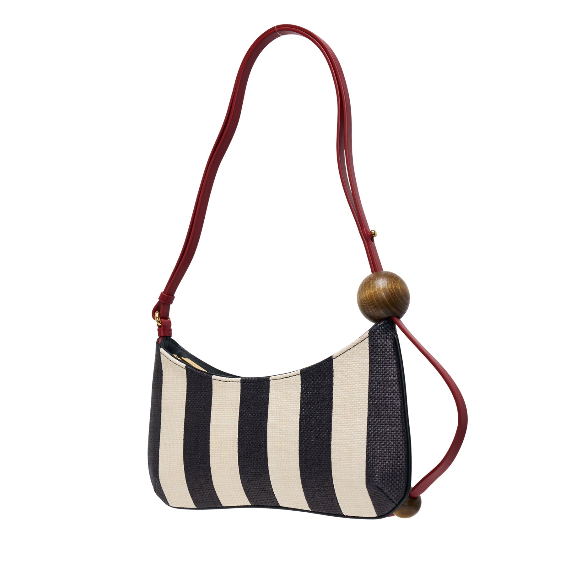 JACQUEMUS Le Bisou Perle delivers French sophistication with playful Mediterranean charm. Crafted from premium striped canvas in navy and cream, featuring adjustable leather cord straps and signature wooden bead details. The curved silhouette and distinctive striped pattern create a statement accessory that embodies the brand's Provence-inspired aesthetic.