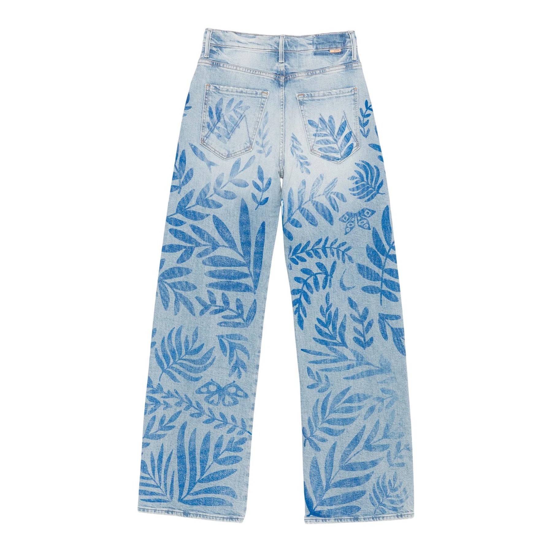 اترك الأمر لي. بنطلون واسع الساق بخصر مرتفع وطول 32 بوصة مع حافة نظيفة. مصنوع من دنيم SUPERIOR شبه صلب، Pressed Leaves هو لون أزرق فاتح مع تلاشي طفيف عند الركبتين ورسم جرافيكي لورقة زرقاء مطبوعة في جميع الأنحاء.