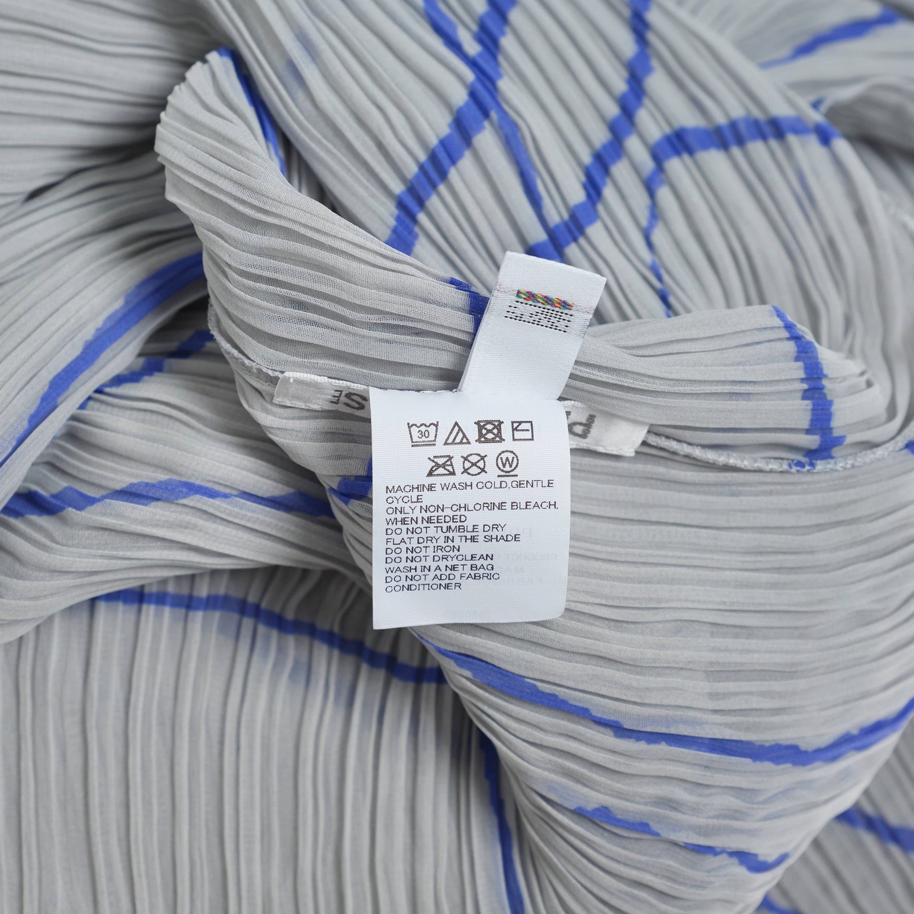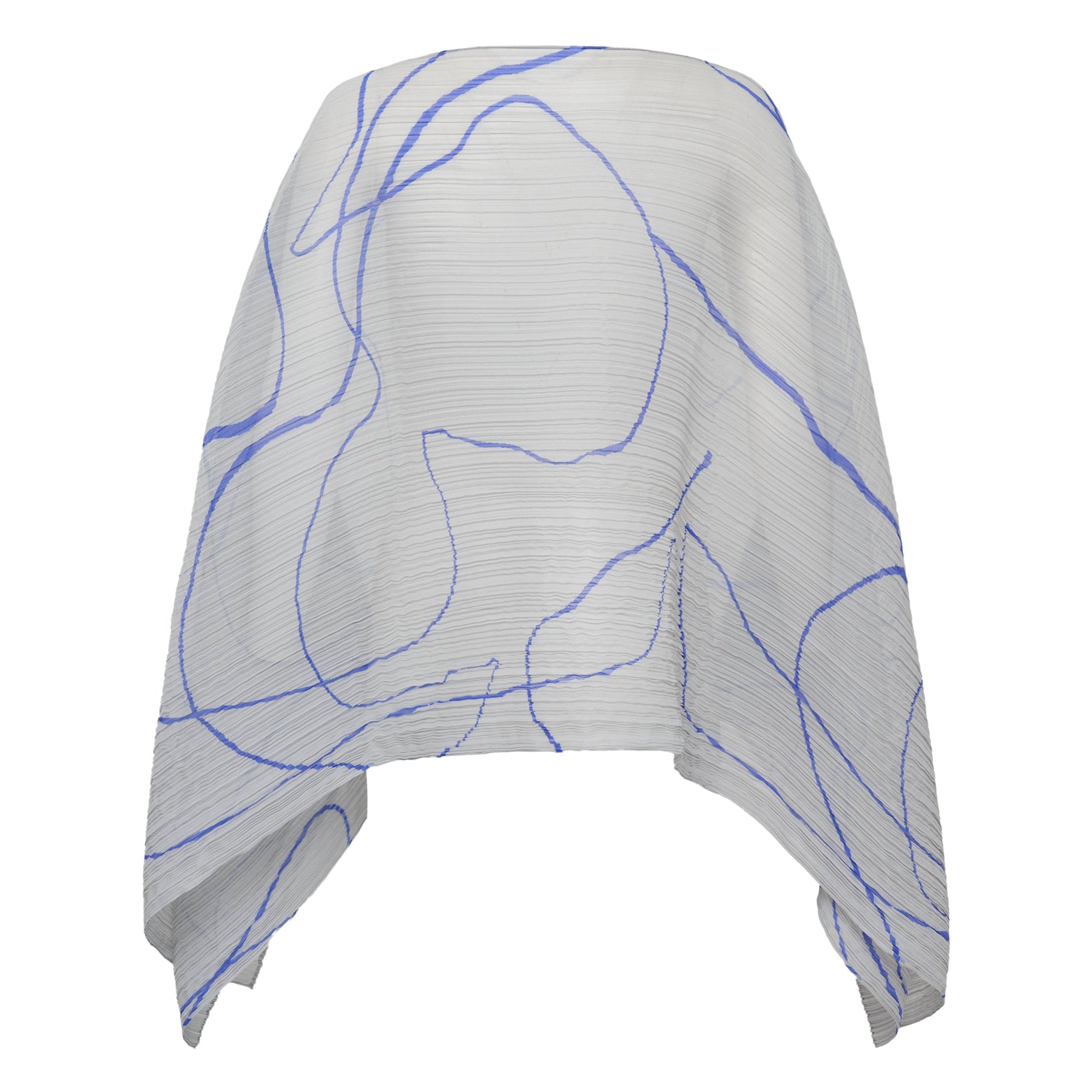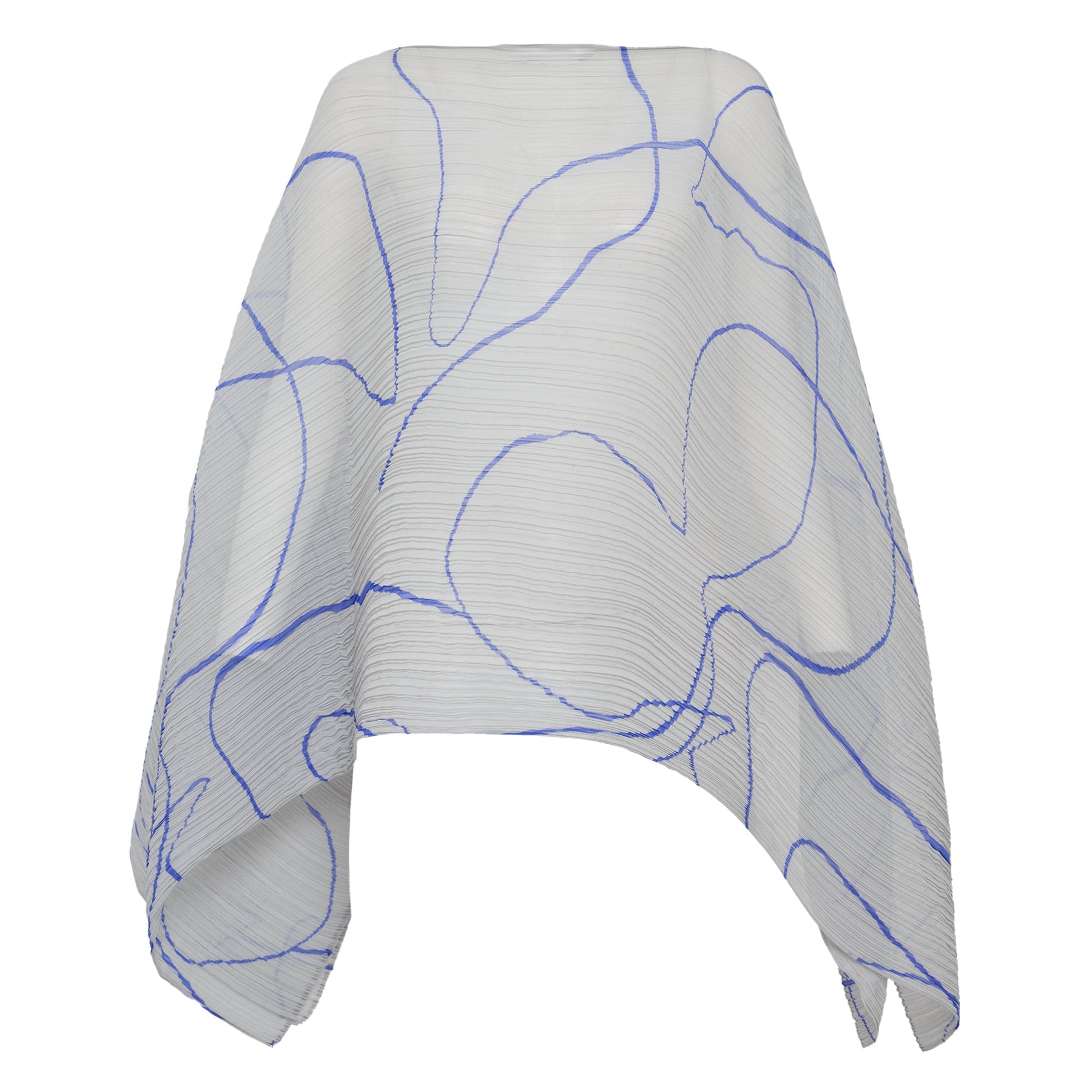 This grey PAUSE MADAME-T is a large pleated stole in a sheer fabric, featuring a striking print of body outlines in various poses, expressed through flowing lines. It can be worn as a regular scarf, or wrapped around the body in different ways using the slit at its centre.