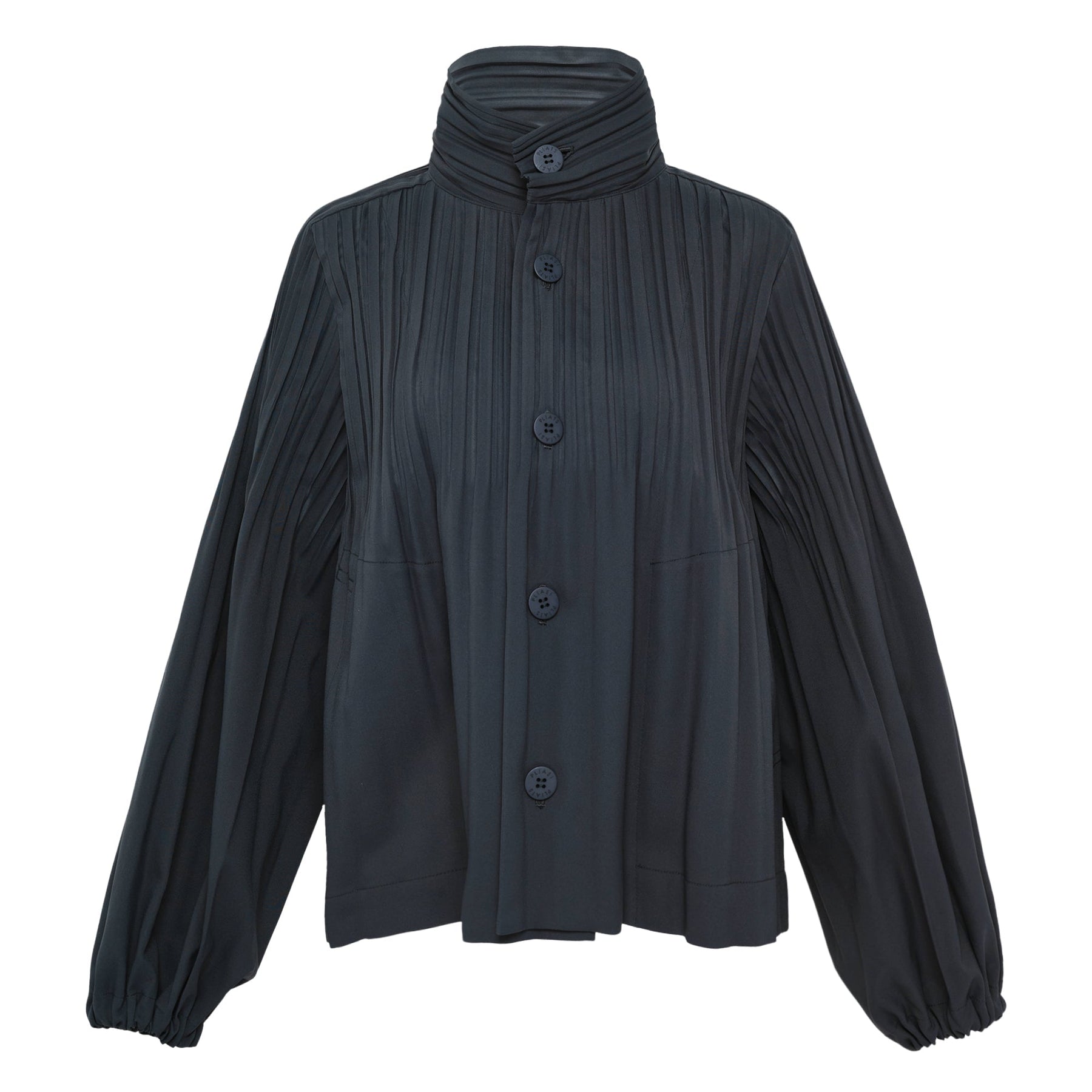 This charcoal pleated jacket features an A-line silhouette with voluminous balloon sleeves, a standing collar, button fastenings and side pockets.