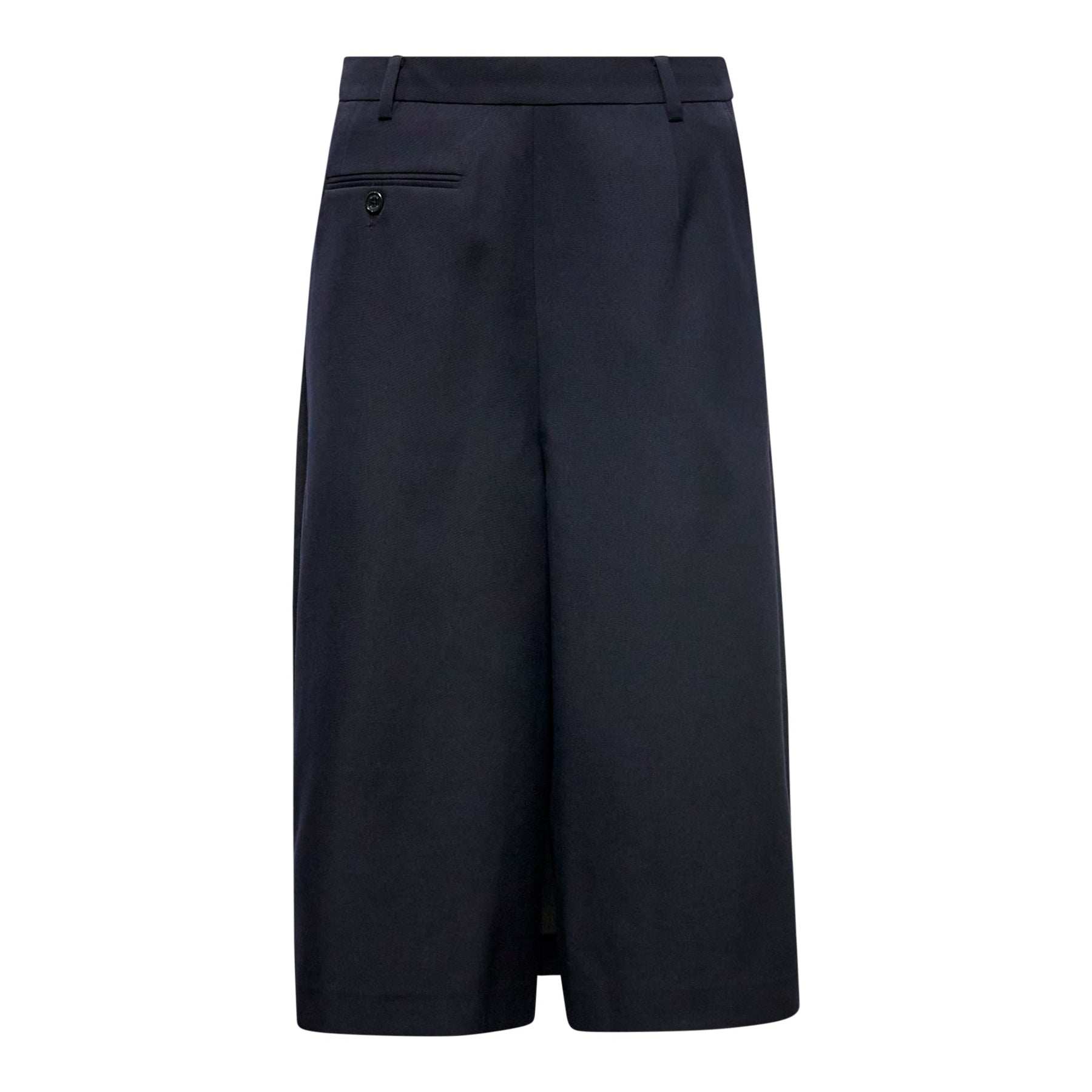 RE;CODE Faux-Skirt Pants deliver innovative hybrid design that combines the comfort of trousers with the sophisticated silhouette of a skirt. Crafted from premium navy cotton blend fabric with a structured wide-leg cut and tailored waistband for a polished finish. The deconstructed front panel creates the illusion of a wrap skirt while maintaining the functionality of modern trousers.