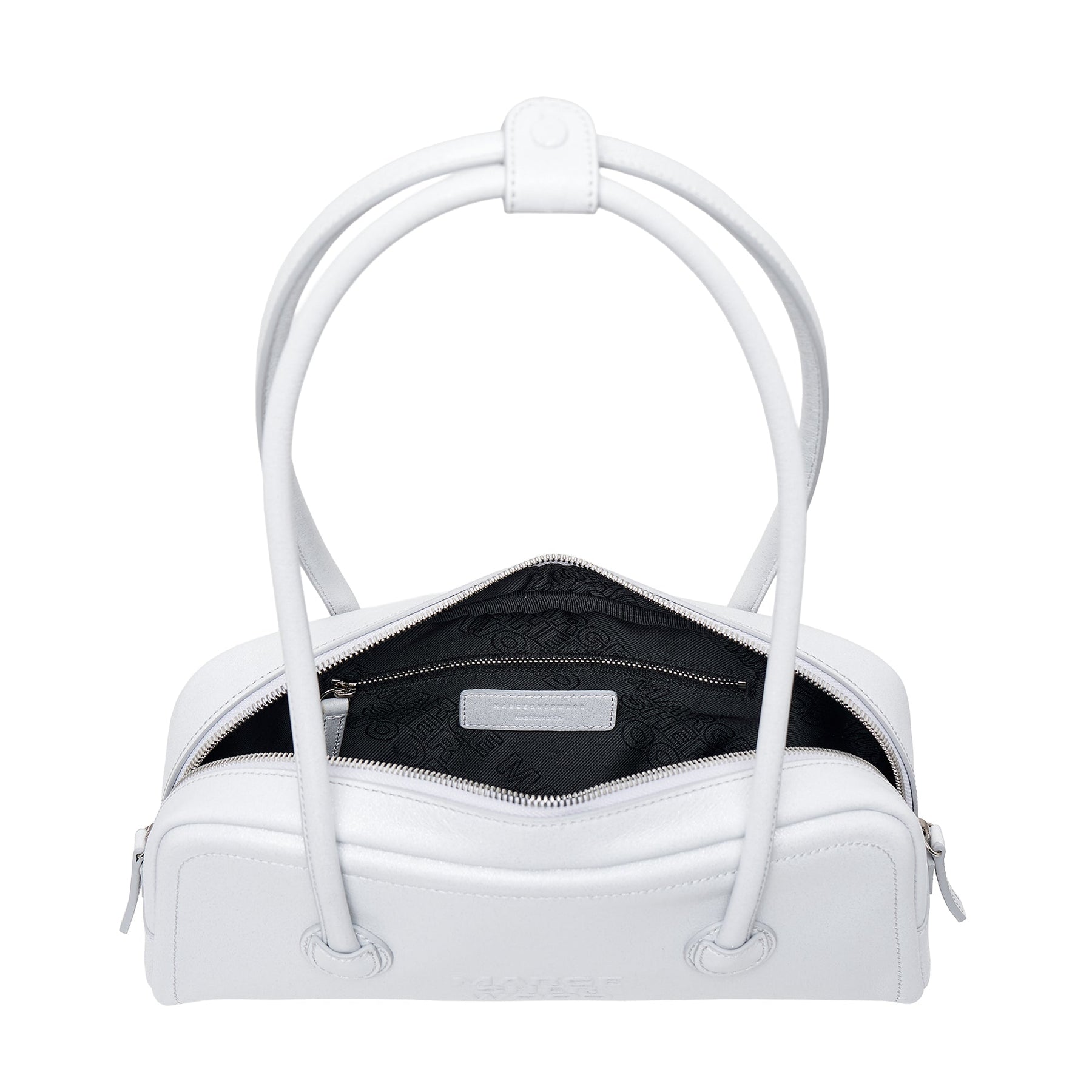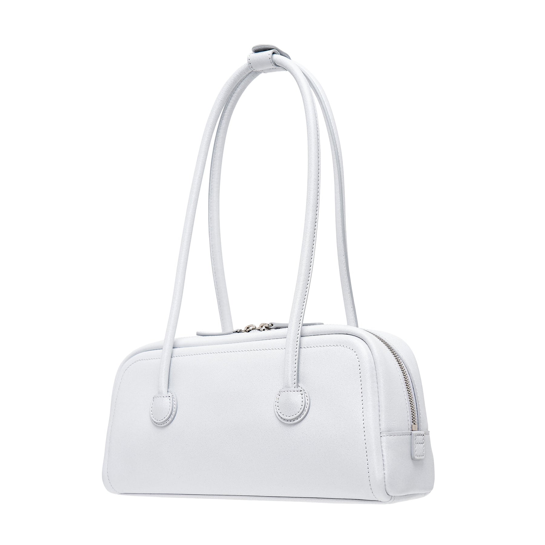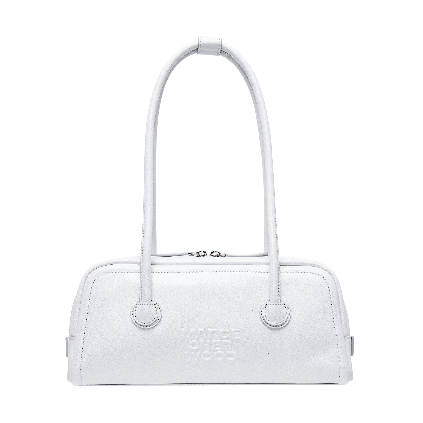 The MARGESHERWOOD Soft Boston EW Bag delivers structured elegance with contemporary minimalist design. Crafted from premium white leather with precise topstitching and polished silver-tone hardware throughout. The elongated East-West silhouette and dual carry handles create a sophisticated statement piece for modern luxury wardrobes.