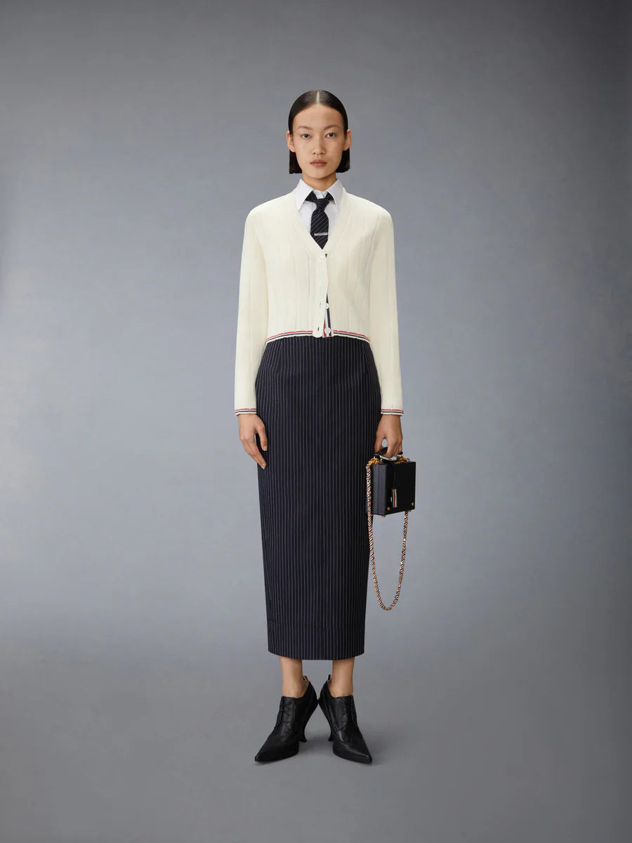 مصنوع من قماش الصوف الفاخر، يتميز هذا الكارديغان بحواف من قماش الجروغرين المخطط على الواجهة وشريط ثلاثي الألوان عند الحافة. يمكنك تنسيقه مع تنورة قلم رصاص عالية الخصر من الصوف المخطط للحصول على مظهر أنيق بلا جهد.