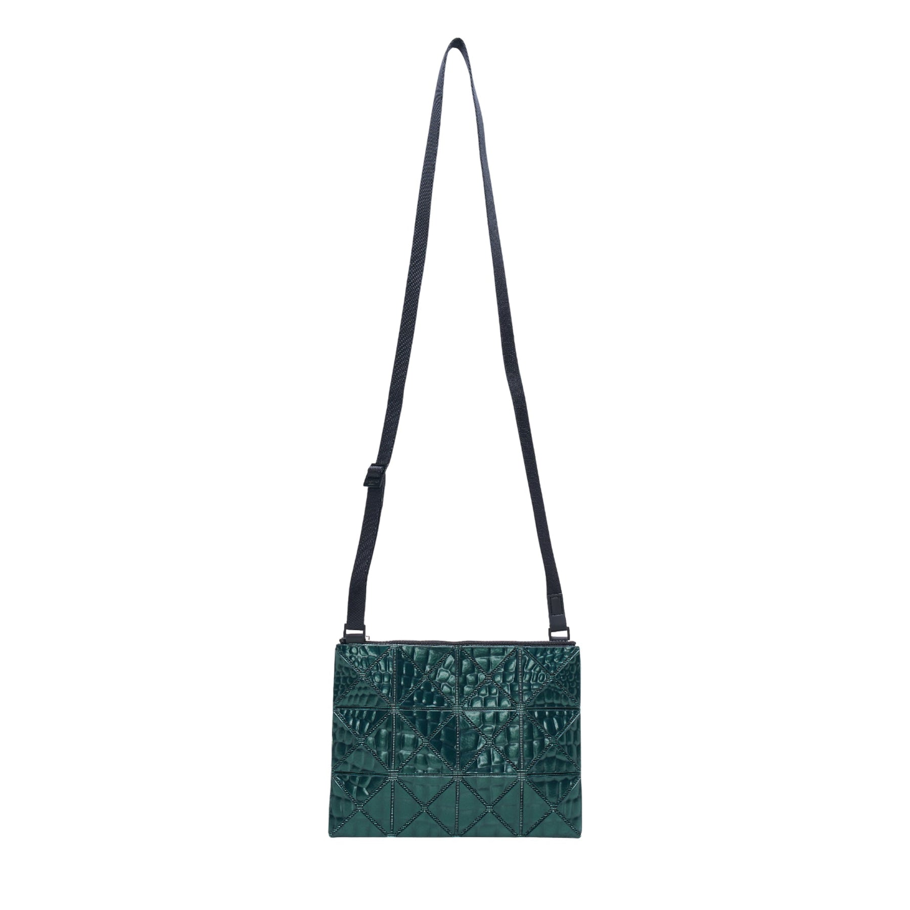 This playful shoulder bag has a texture reminiscent of a kaiju monster, which is achieved using a three-dimensional, embossed metallic material. The bumpy unevenness of the triangular pieces subtly expresses the shading of the colors.