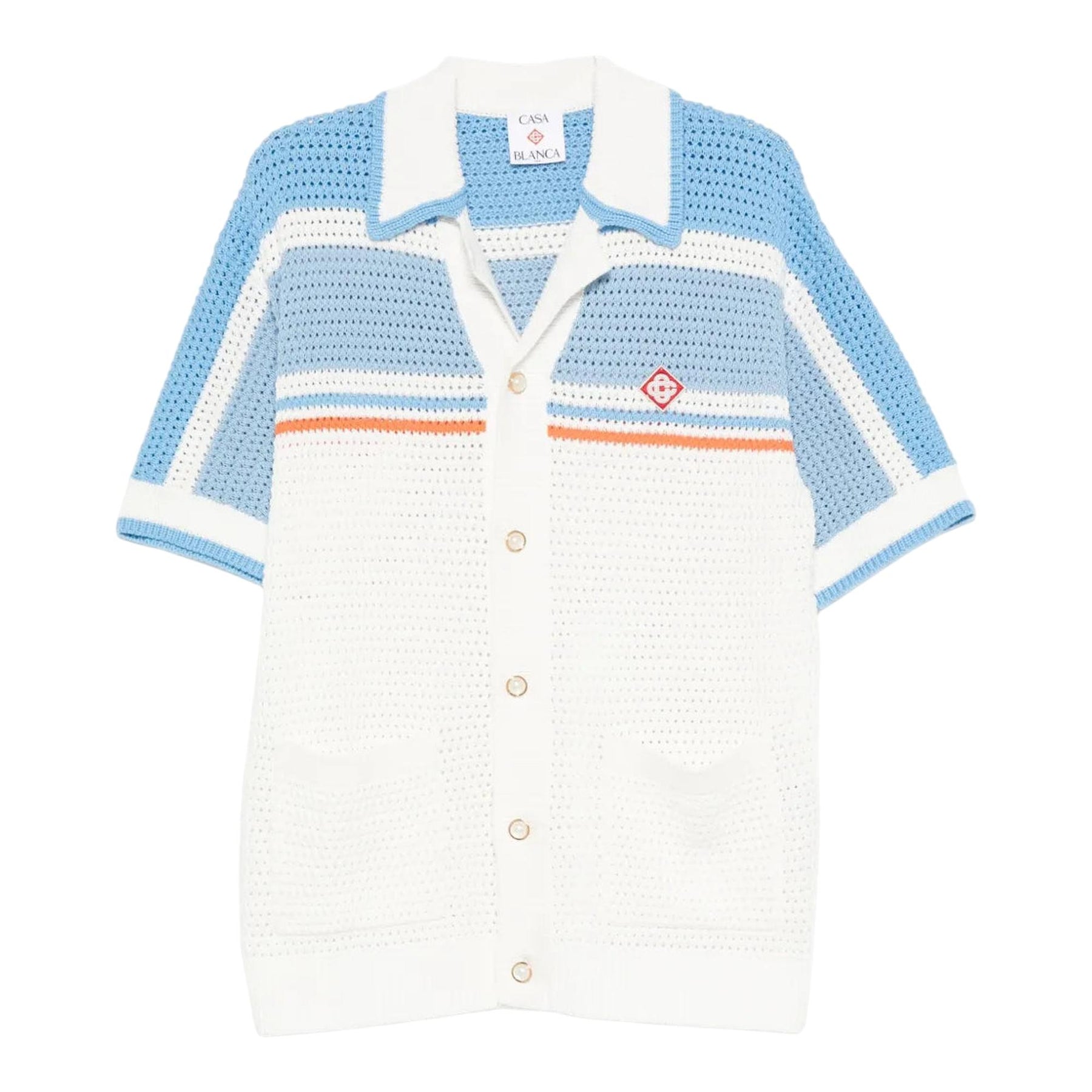 The tennis crochet shirt is a short-sleeve knitted design crafted from crochet cotton fabric in soft natural colours and features the house's signature diamond logo. Completed with signature gold rim pearl buttons, stripe details on the shoulders and down the sleeves, front patch pockets, and striped edge detail on the collar, and cuffs.