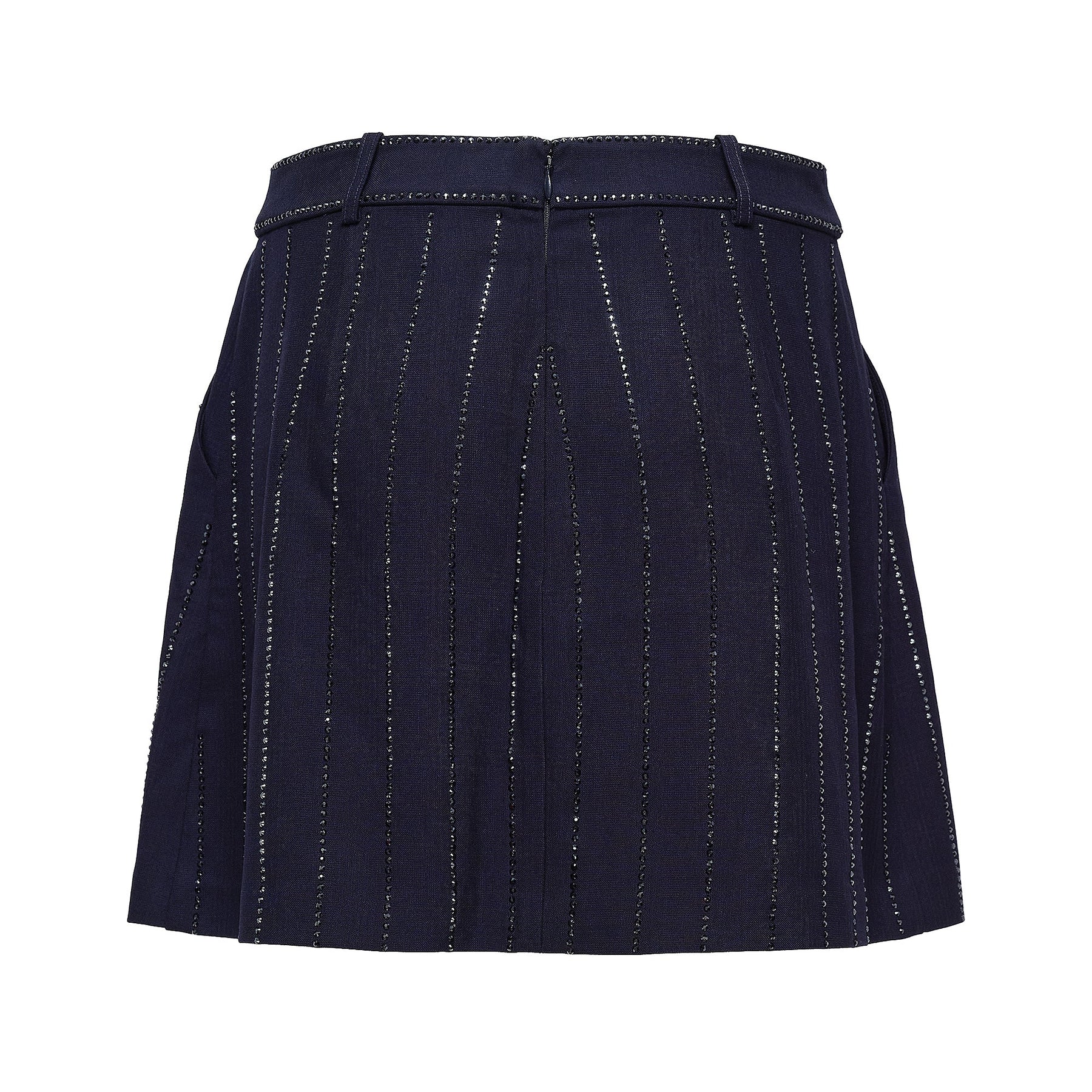 Sparkling with rhinestone pinstripes, this navy mini's belted waist, pleated accents and leg-lengthening hem make it an effortless party piece. Add our matching blazer for extra style points.