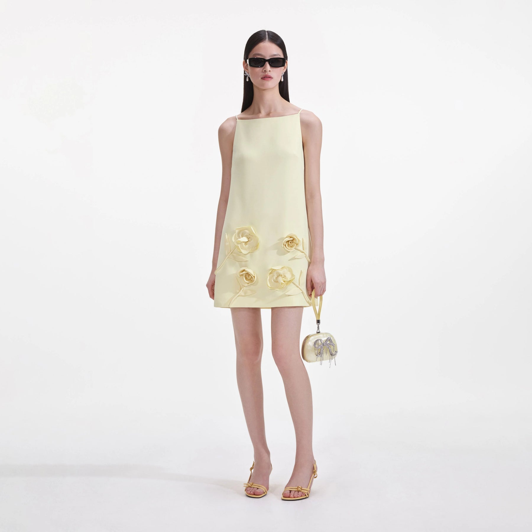 Everything's coming up roses in this yellow crepe shift dress. Sculptural flower motifs add a touch of luxurious detailing to the minimalist cut. Show off its mini length with a pair of platforms.