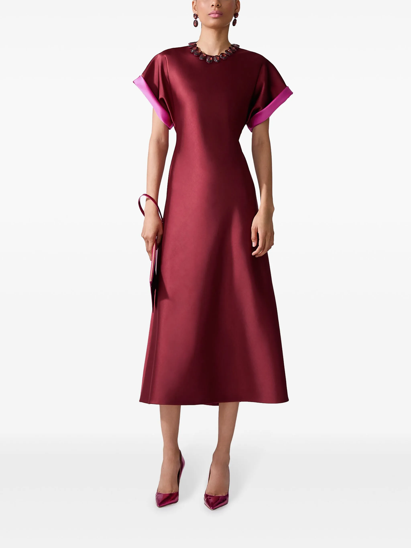 Rolled sleeves reveal a glimpse of contrasting color, giving this bias-cut satin dress a fresh, contemporary edge. Concealed zip fastening at back
