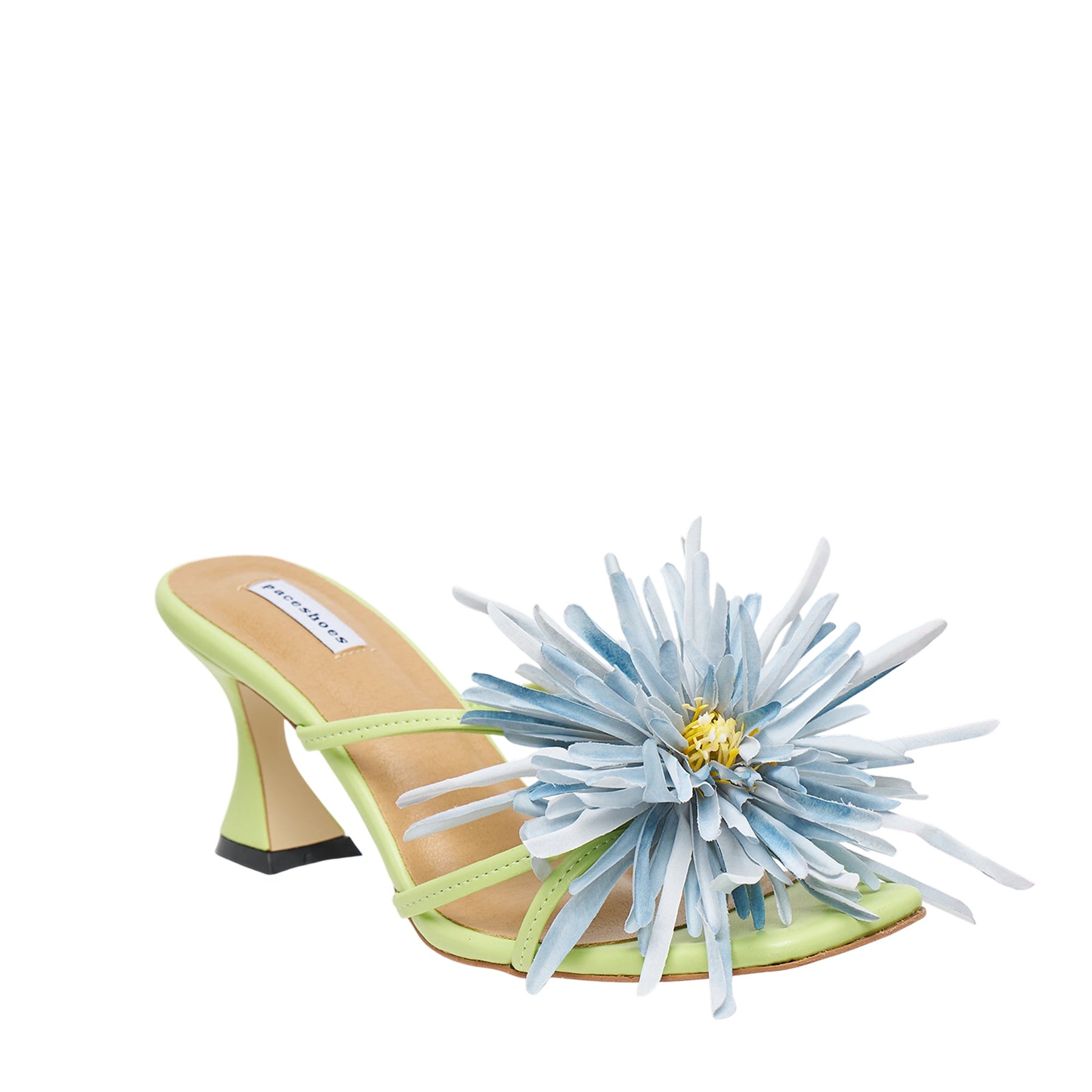Pace Shoes Garden Series Heels deliver botanical elegance with artistic floral detailing and contemporary styling. Crafted with premium strappy construction in fresh mint green, featuring an eye-catching blue pom-pom flower accent that creates visual impact. The sculptural curved heel and minimalist straps showcase sophisticated femininity with playful garden-inspired charm.