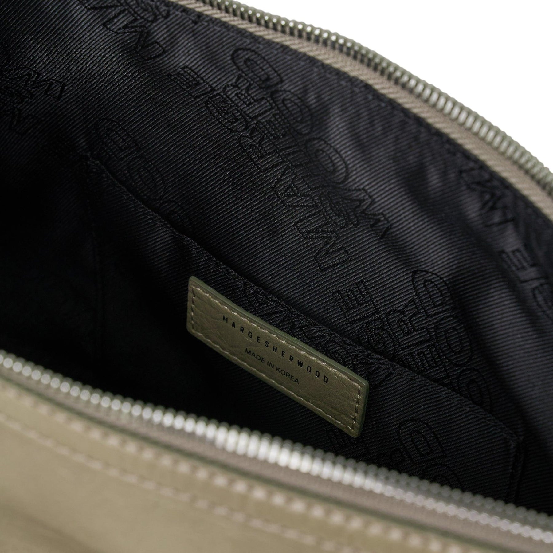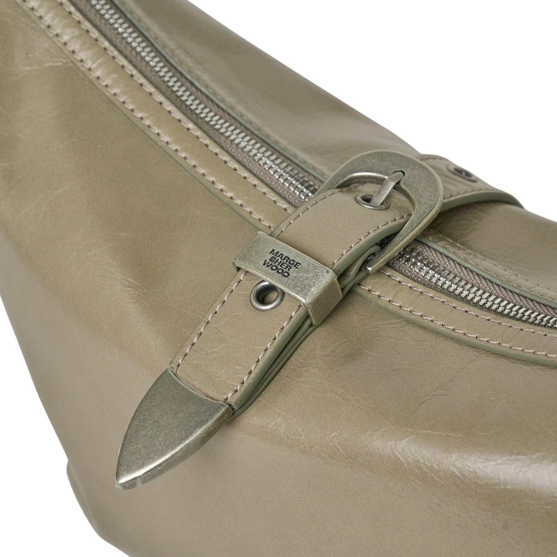 • Medium-sized slouchy hobo bag with belt strap, metal buckle, and ring decoration engraved with the Magisherwood logo