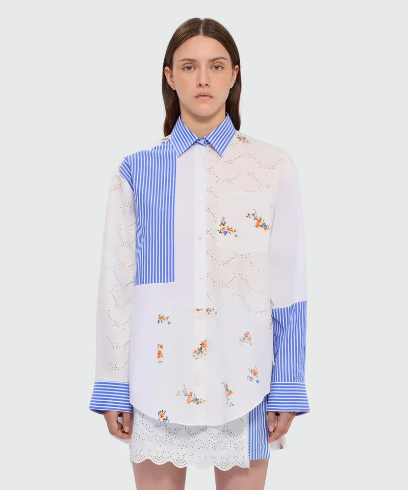MSGM Patchwork Floral Shirt delivers contemporary Italian design with bold mixed-print construction and modern tailoring. Crafted from premium cotton poplin featuring contrasting blue and white striped panels with delicate floral embroidered accents throughout. The asymmetrical patchwork design and classic collar create a sophisticated statement piece that balances feminine florals with structured menswear elements.