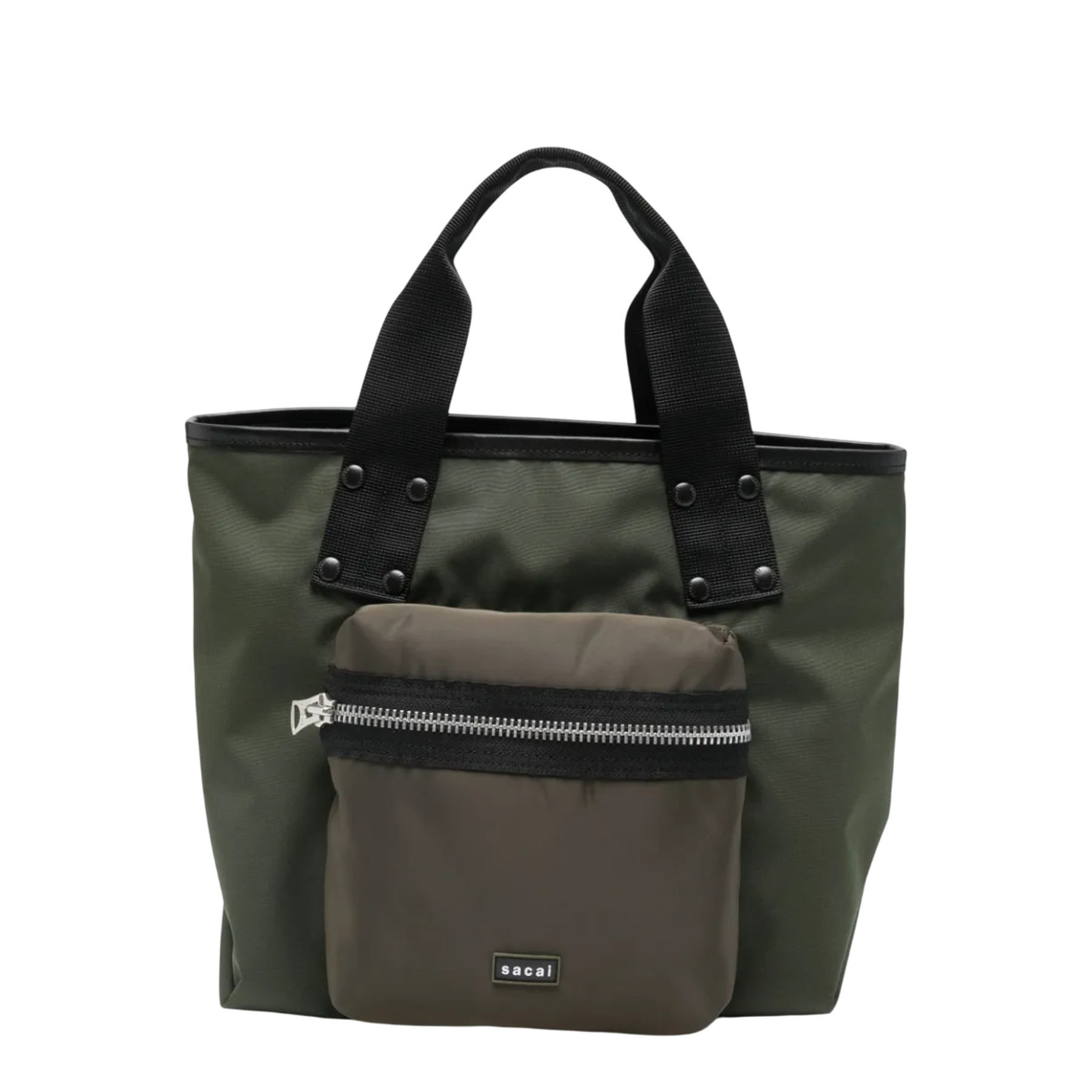 The sacai Pocket Tote Bag Medium delivers hybrid functionality with the brand's signature deconstructed aesthetic and modular design approach. Crafted from durable olive green canvas with contrasting taupe detachable pouch, featuring black webbing handles and industrial metal hardware throughout. The innovative dual-bag system and architectural construction create a versatile statement piece for contemporary wardrobes.