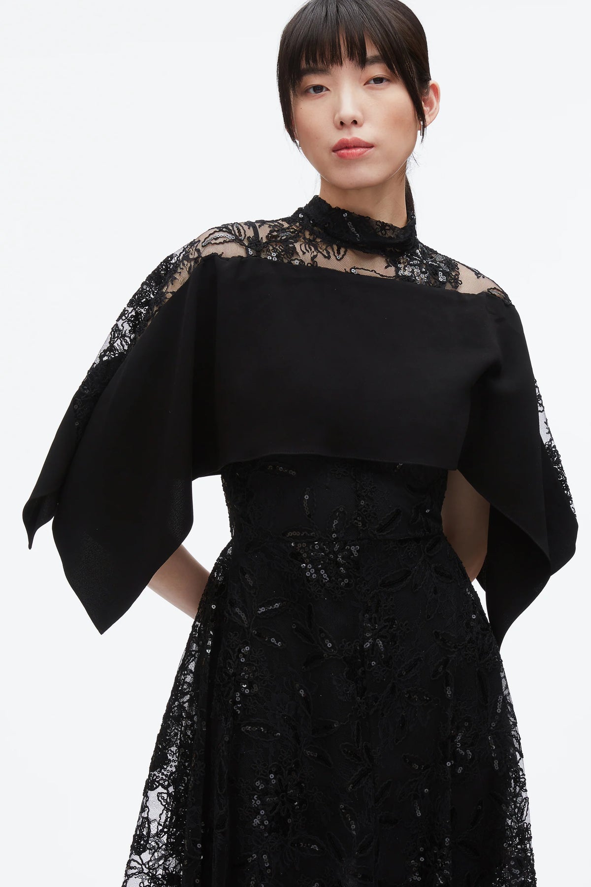 3.1 Phillip Lim Sequin Lace Mockneck Flounce Dress delivers dramatic elegance with contemporary sophistication for special occasions. Crafted from delicate black lace with scattered sequin embellishments throughout, featuring a high mockneck and tiered flounce layers. The flowing silhouette and intricate lace construction create an enchanting statement piece with the brand's signature modern femininity.