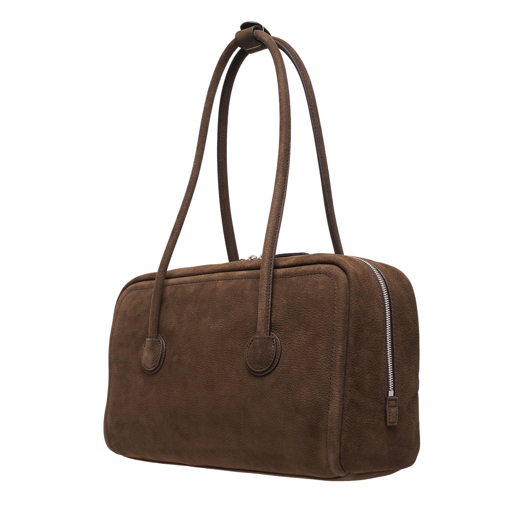 The MARGESHERWOOD Soft Boston Bag delivers contemporary elegance with structured functionality for modern lifestyles. Crafted from premium brown leather with subtle pebbled texture, featuring dual top handles and secure zip closure throughout. The architectural silhouette and minimalist branding create a versatile statement piece for professional and casual occasions.