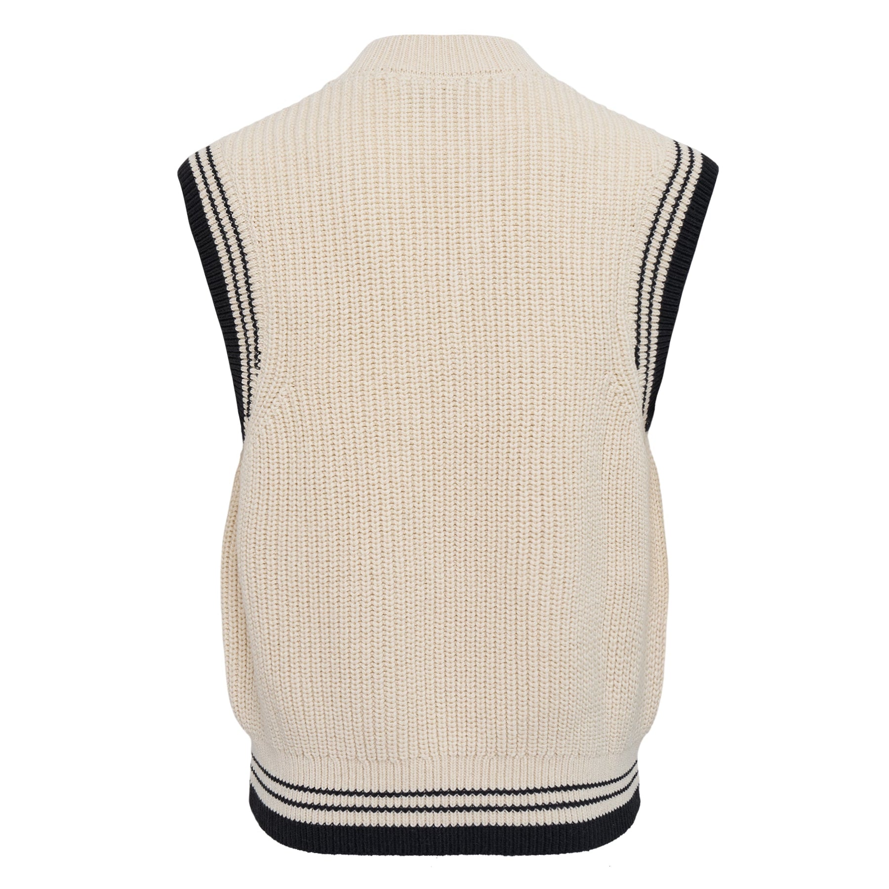 AMI V Neck Sleeveless Sweater delivers Parisian sophistication with timeless preppy styling. Crafted from premium knitted cotton in cream with contrasting navy stripe details, featuring classic cricket-inspired design elements. The relaxed fit and signature AMI heart logo create an effortlessly chic piece for contemporary layering.