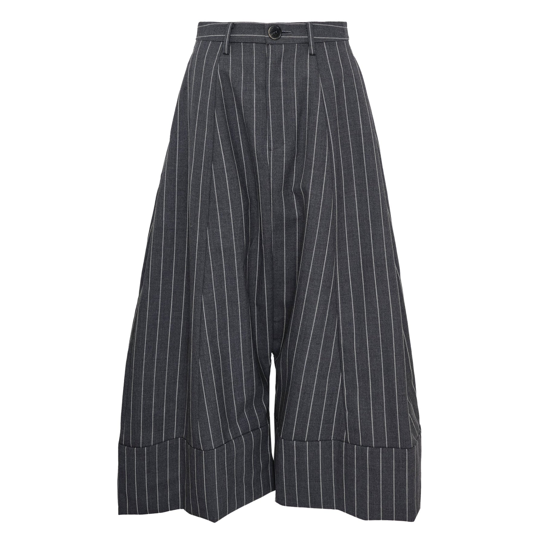 ENFOLD Wide Sarouel Trousers deliver contemporary Japanese minimalism with relaxed sophistication and architectural silhouette. Crafted from premium pinstripe wool blend in charcoal gray, featuring dropped crotch construction and wide-leg cut for modern comfort. The structured tailoring and cropped length create a distinctive statement piece that bridges formal and casual dressing.