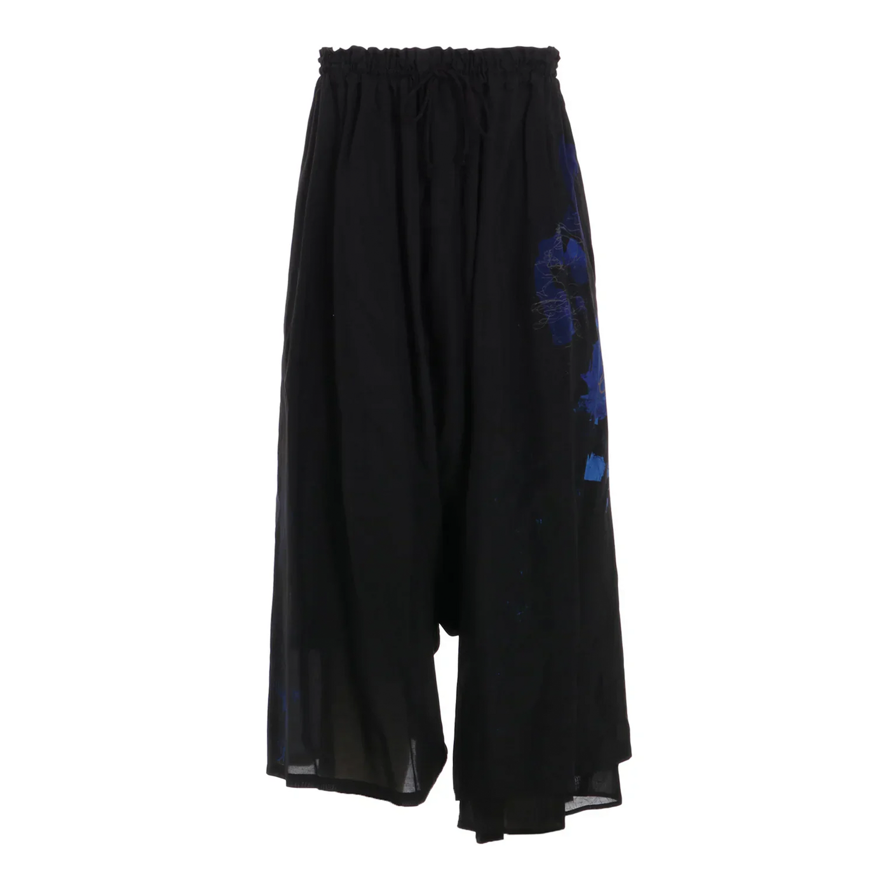 This pair of pants features a flower sketch pattern with a soft texture, providing a refreshing feel, perfect for summer. The design highlights a unique double-layer on the left hem, with an adjustable waist using elastic and a drawstring. Exercise caution when handling to prevent seams from opening under excessive pulling.