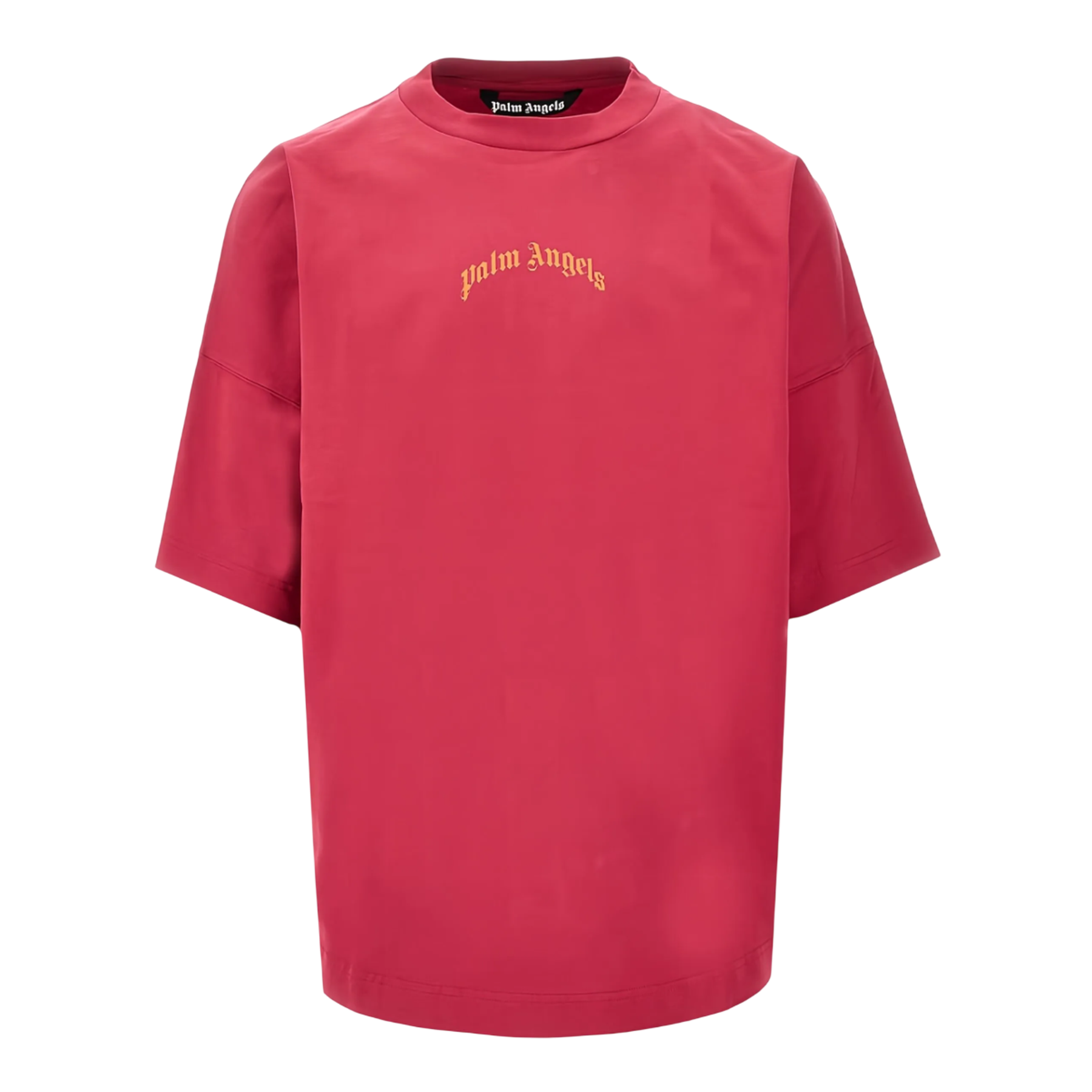 The Palm Angels Back Curved Logo Over Tee delivers streetwear luxury with oversized comfort and signature Italian craftsmanship. Made from premium cotton in vibrant coral red, featuring the iconic curved Palm Angels logo in gold lettering across the chest. The relaxed fit and bold colorway create an elevated casual statement piece for contemporary streetwear enthusiasts.