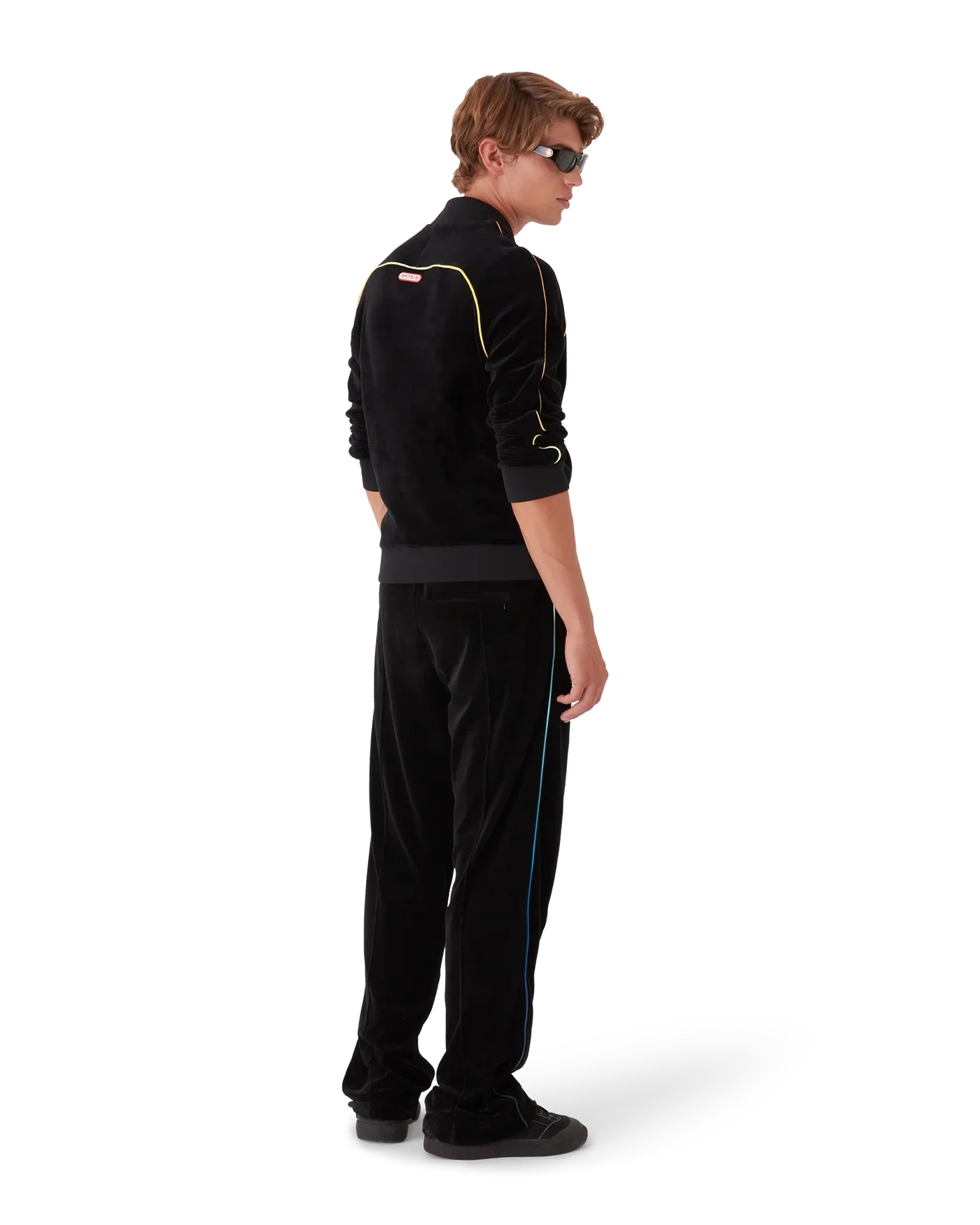 The gradient piping velour track jacket is a long-sleeve design featuring the house's interlocking CC logo and Casablanca logo patch. Completed with a zip closure featuring signature diamond logo zipper tab, piping details from the shoulders, down the sleeves, and across the chest and back, a Casablanca logo below the yoke written in Japanese, and a rib baseball collar, cuffs and hem.