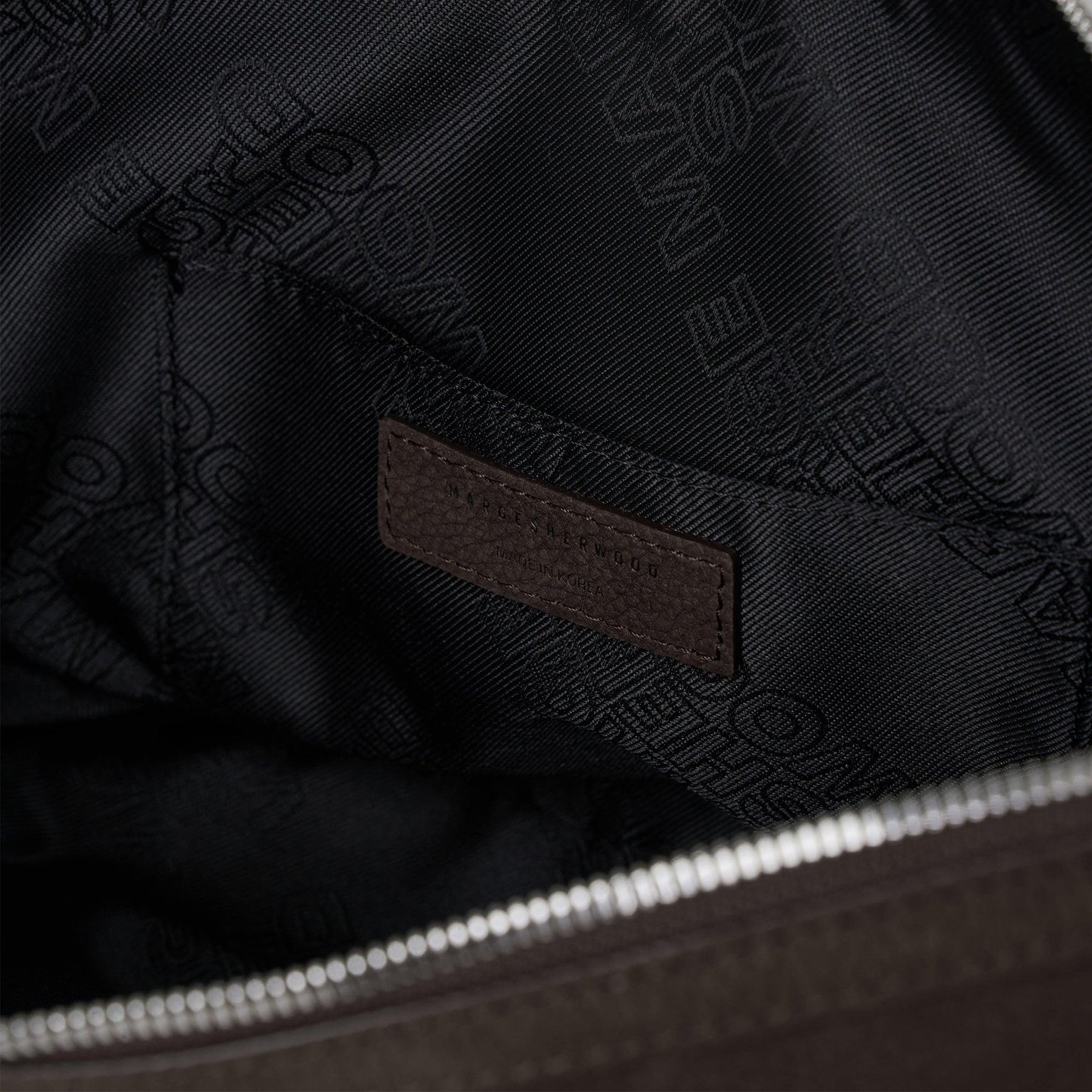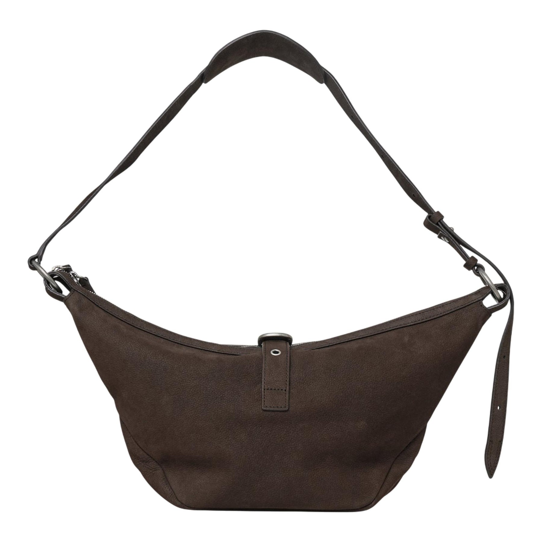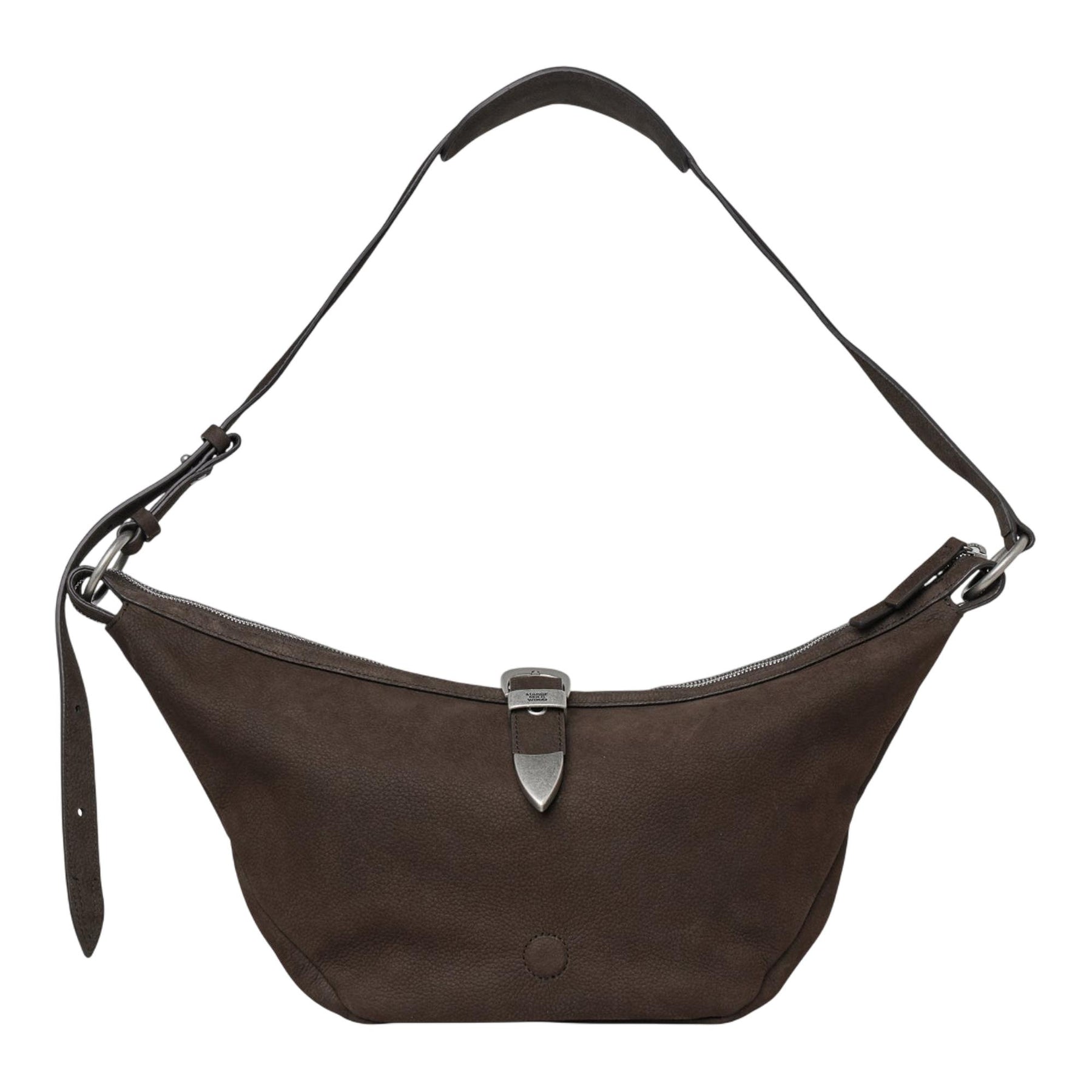 • Medium-sized slouchy hobo bag with belt strap, metal buckle, and ring decoration engraved with the Magisherwood logo