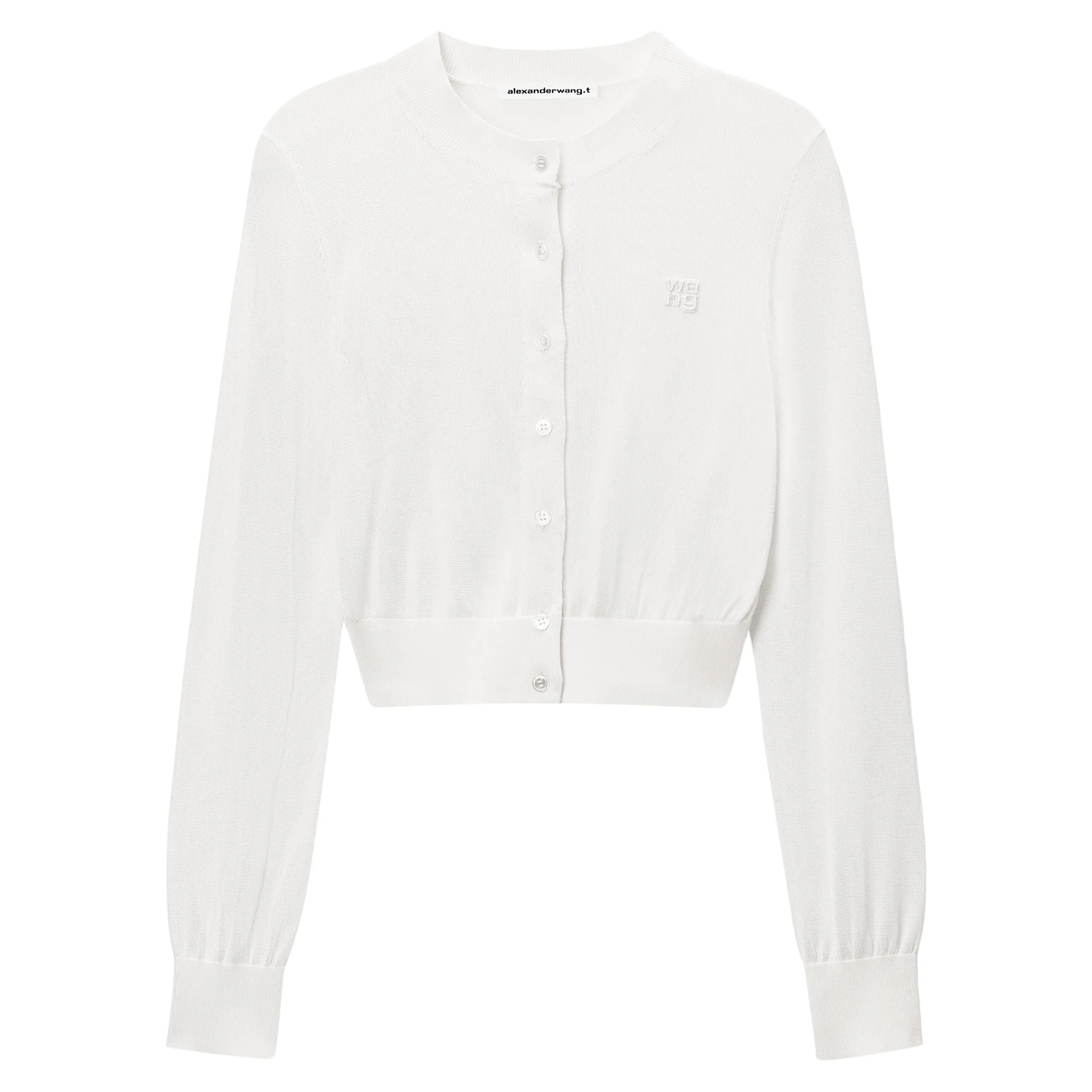 A stacked logo at the chest accents this soft white cropped cardigan, fastened by shell buttons.