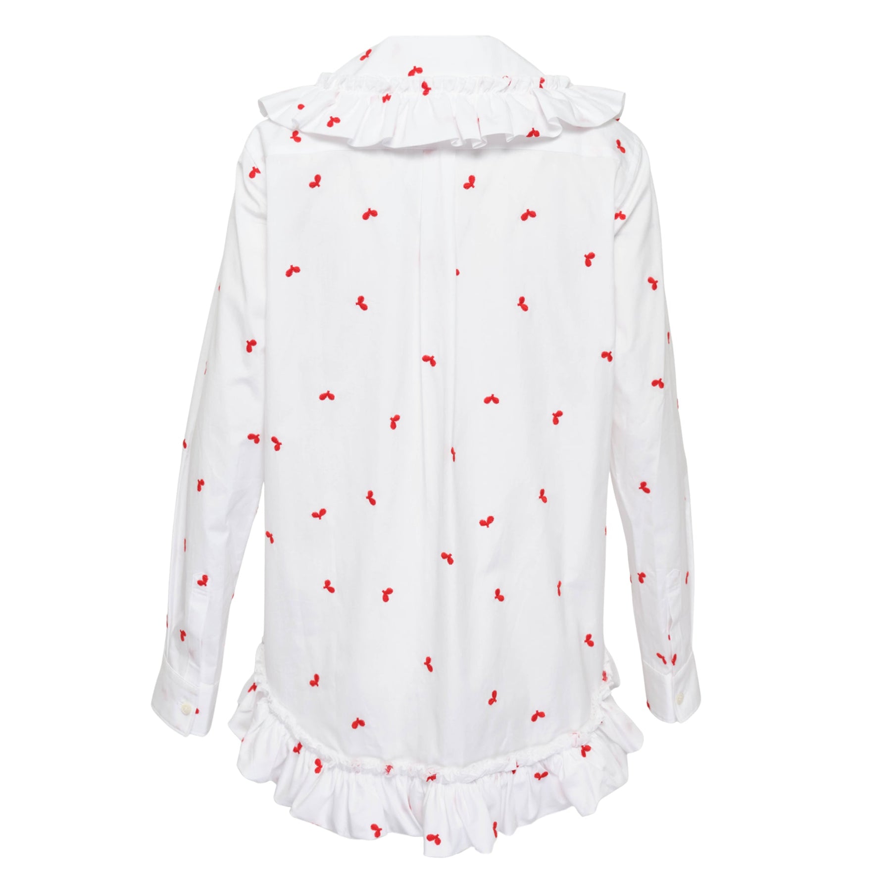 COMME des GARCONS GIRL Embroidery Leaf Pattern Blouse delivers avant-garde femininity with playful botanical detailing and signature ruffled construction. Crafted from crisp white cotton with delicate red embroidered cherries scattered throughout, featuring exaggerated collar and cuff ruffles. The oversized silhouette and whimsical embroidery create a distinctive statement piece that embodies the brand's conceptual approach to contemporary fashion.