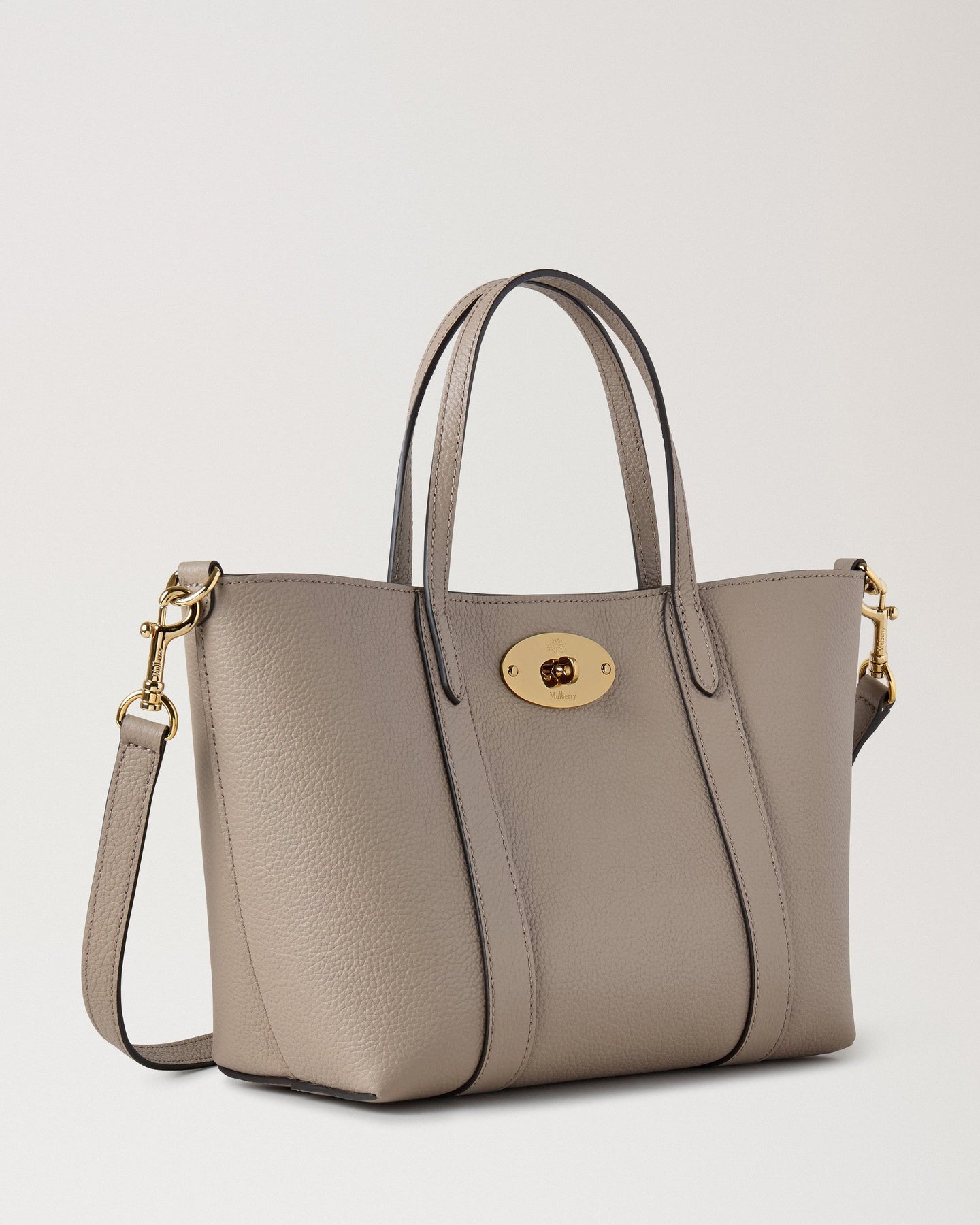The Mulberry Mini Bayswater Tote delivers timeless British luxury in a compact, versatile silhouette perfect for everyday elegance. Crafted from premium small classic grain leather in sophisticated taupe, featuring the iconic postman's lock closure and refined stitching details. The structured design and dual carry options make this an essential piece that transitions seamlessly from day to evening.
