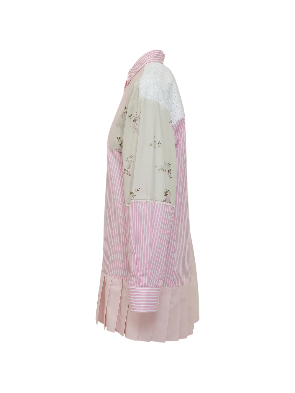 MSGM Patchwork Floral Shirt Dress delivers contemporary femininity with avant-garde construction and mixed textile artistry. Crafted from a unique combination of eyelet cotton, striped poplin, and delicate floral prints in soft pink and white tones, creating a distinctive patchwork composition. The asymmetrical design philosophy and signature MSGM aesthetic transform the classic shirt dress into a statement piece for modern wardrobes.