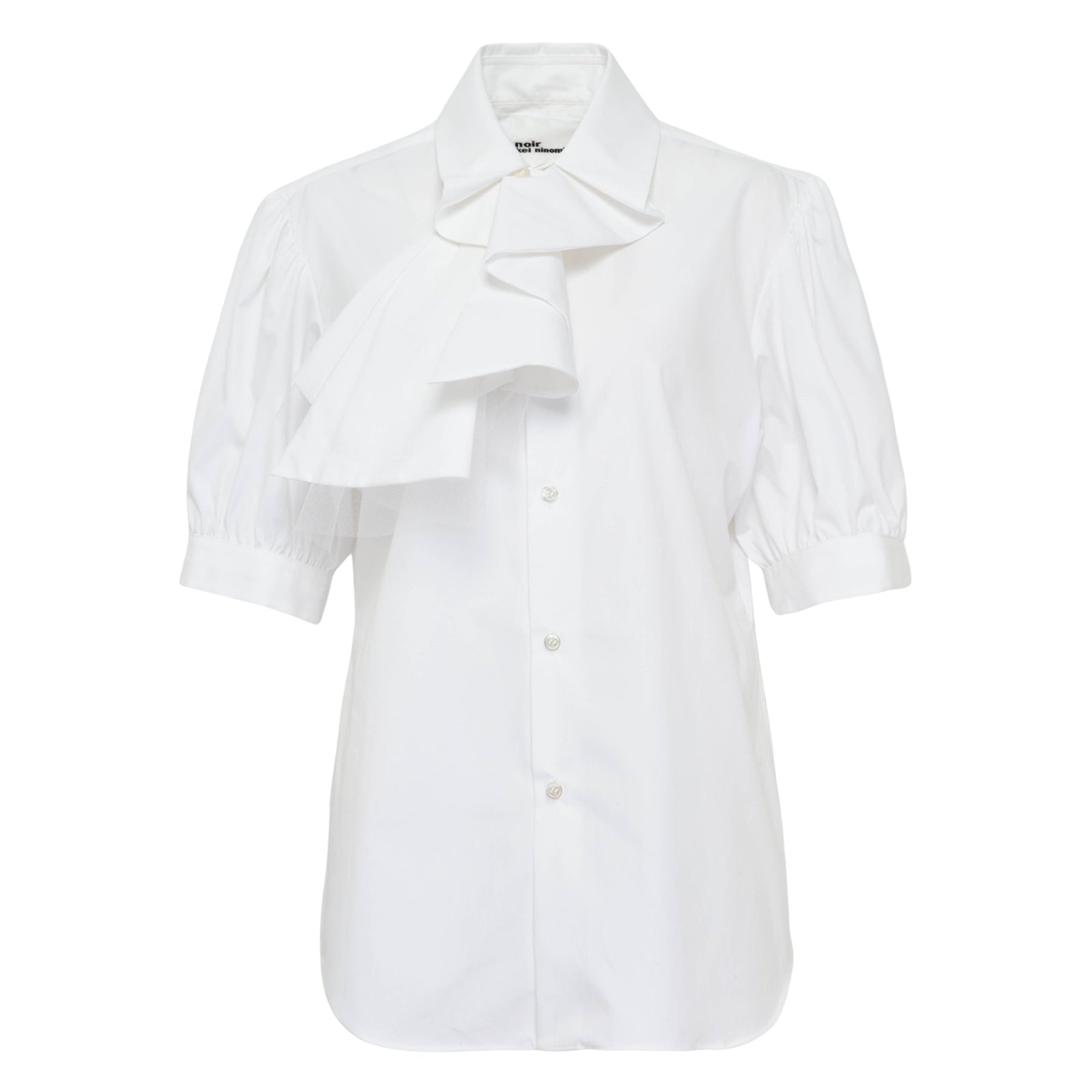 Noir Kei Ninomiya Cotton Broad x Nylon Tulle delivers avant-garde layering with architectural construction and ethereal contrast. Crafted from crisp cotton broadcloth combined with delicate nylon tulle overlay, featuring deconstructed shirt elements with dramatic bow detailing. The innovative fabric pairing and signature Noir Kei Ninomiya aesthetic create a striking statement piece that challenges traditional garment construction.