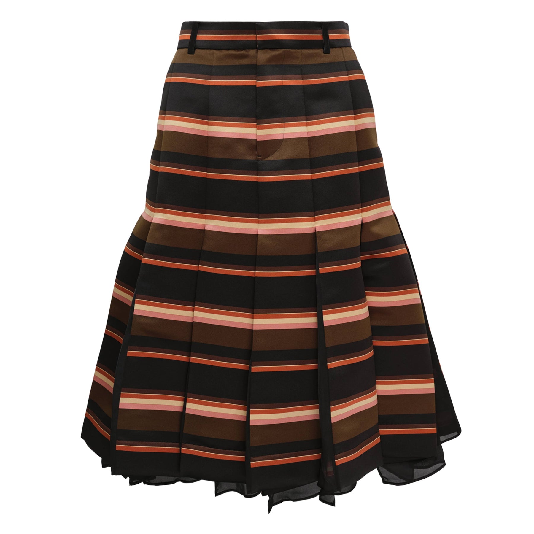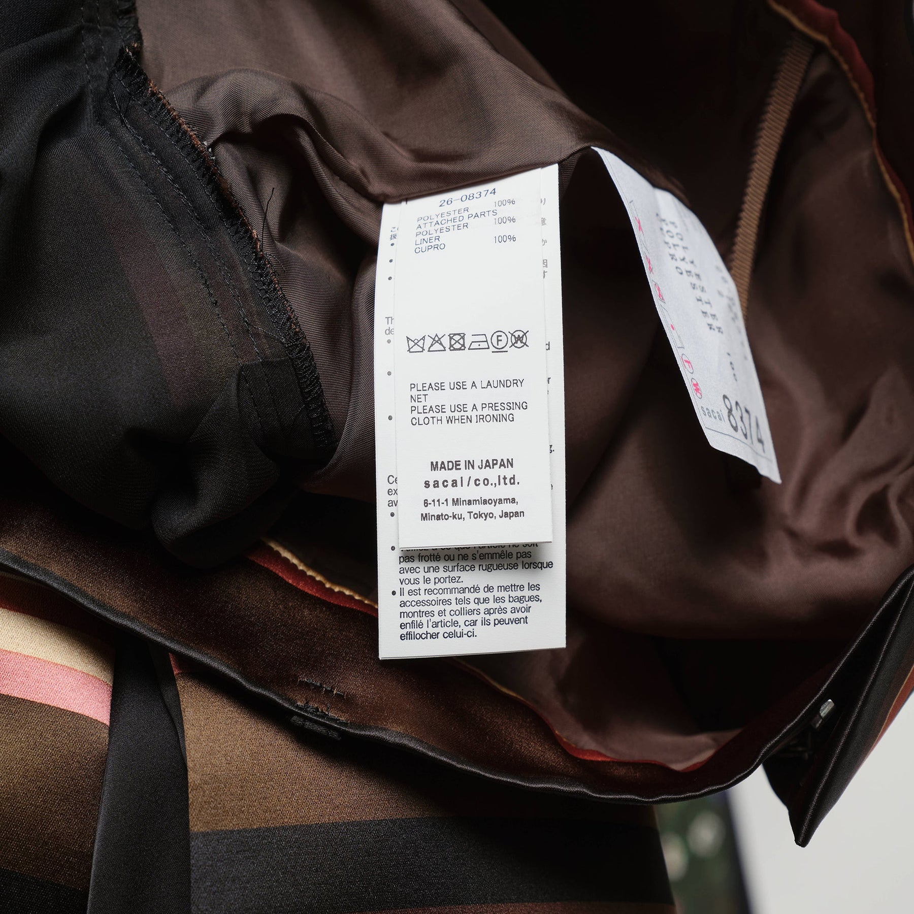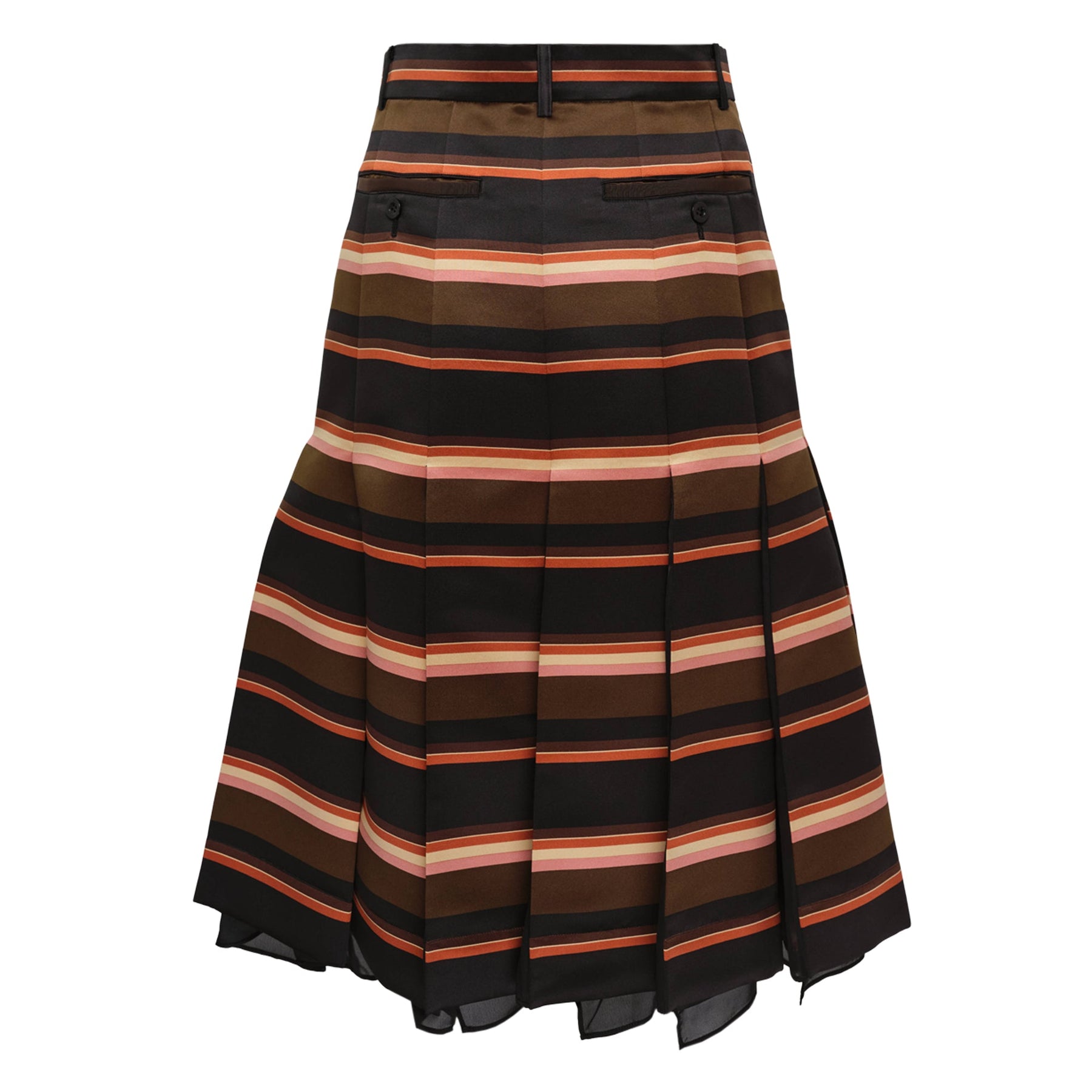 The sacai Horizontal Stripe Skirt delivers Japanese avant-garde design with sophisticated pattern mixing and architectural construction. Crafted from premium woven fabric featuring multi-tonal horizontal stripes in black, brown, orange, and pink tones with pleated detailing throughout. The brand's signature deconstructed silhouette and layered aesthetic create a statement piece that embodies sacai's innovative approach to contemporary fashion.