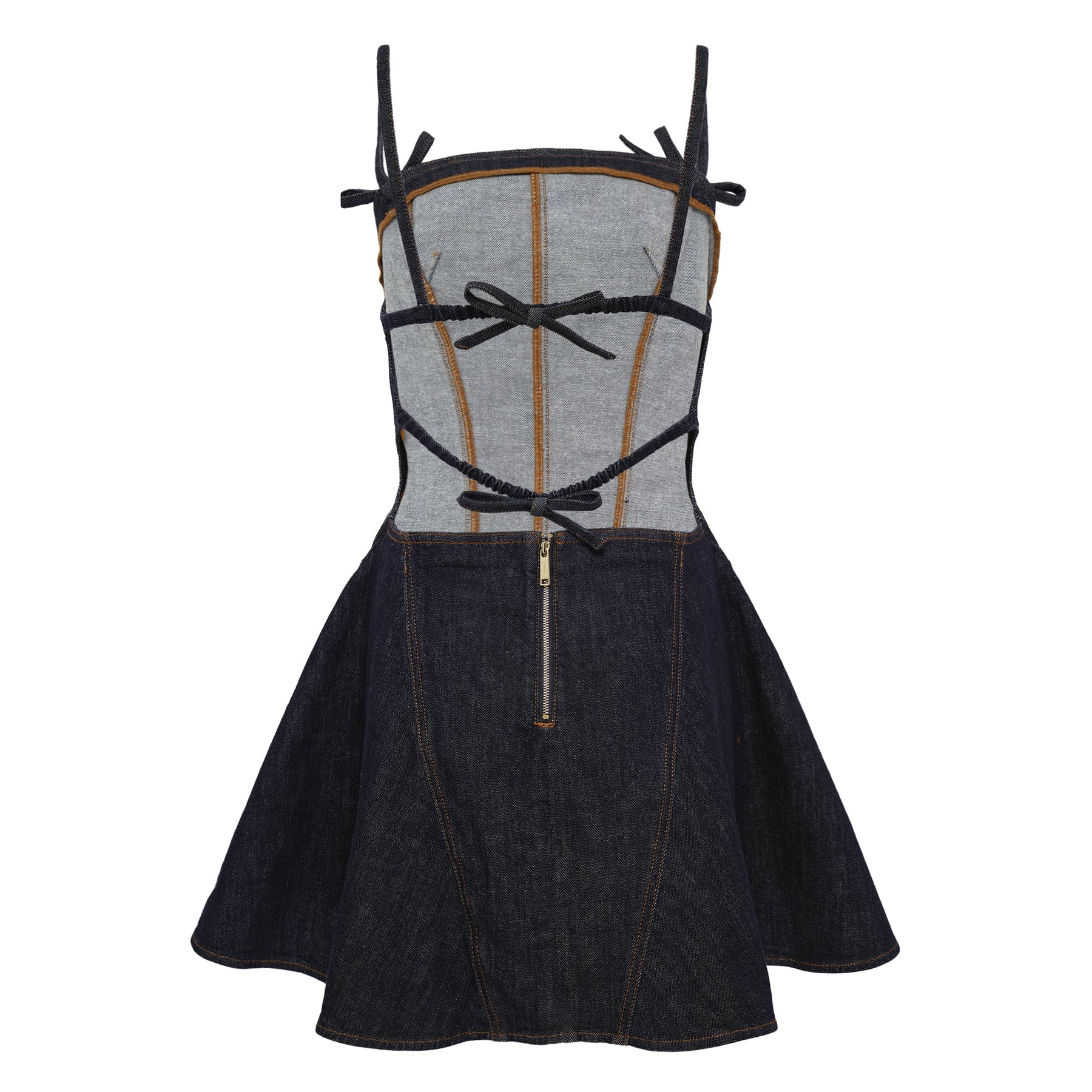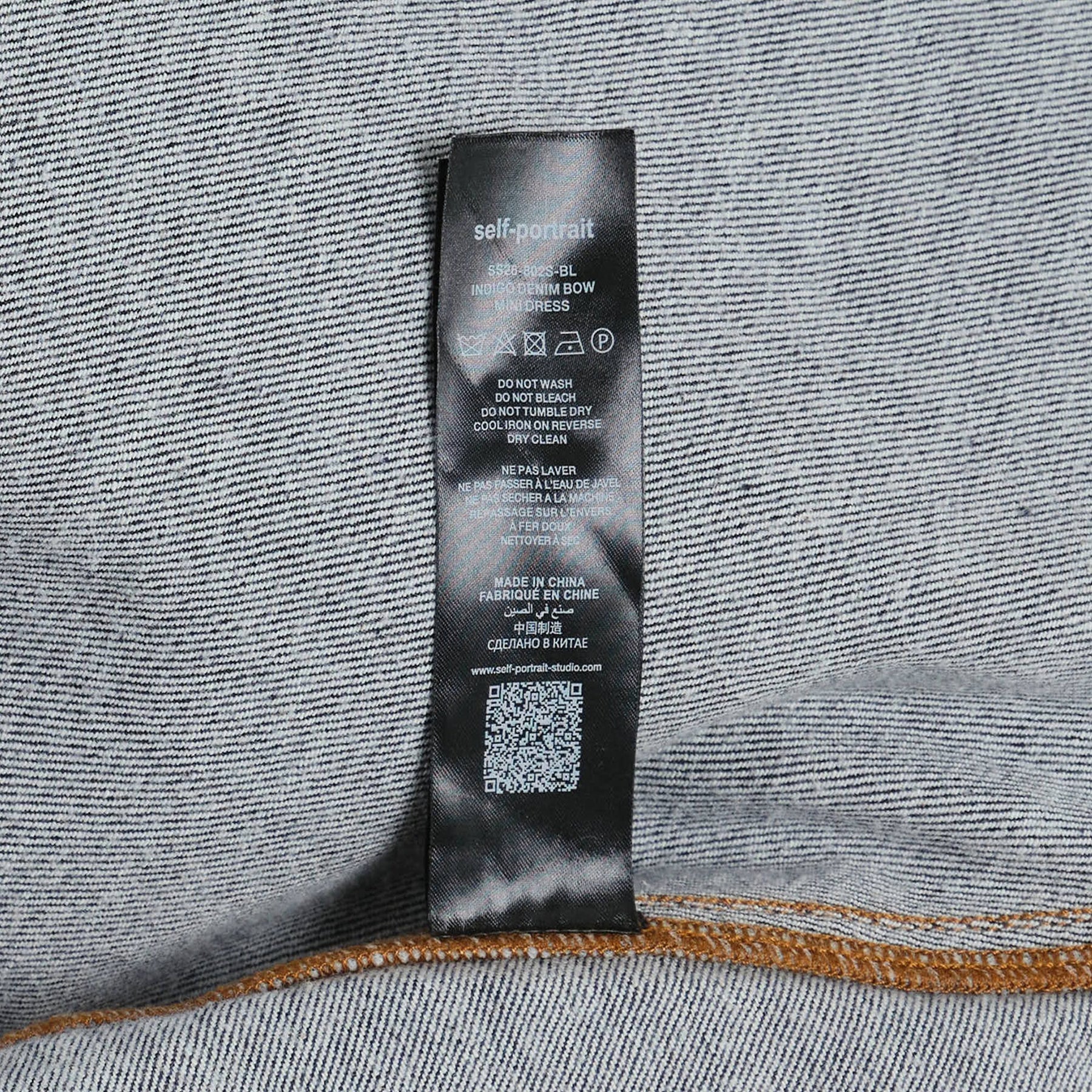 Self-Portrait Indigo Denim Bow Mini Dress delivers contemporary femininity with structured tailoring and playful bow details. Crafted from premium indigo denim with contrast topstitching, featuring adjustable ribbon tie straps and a fitted bodice that flows into a flared mini skirt. The structured corset-style design and signature Self-Portrait aesthetic create a perfect balance of vintage charm and modern sophistication.
