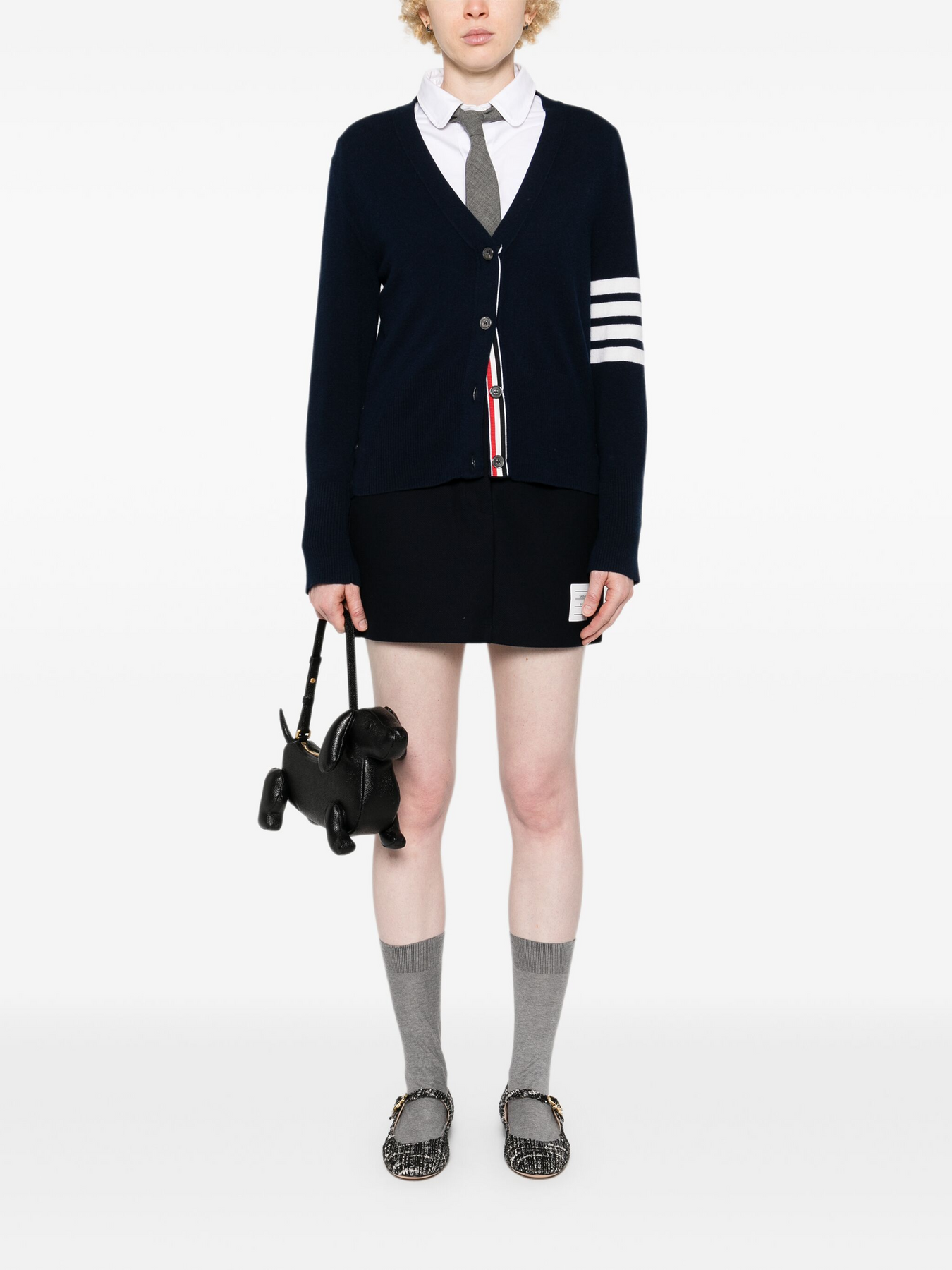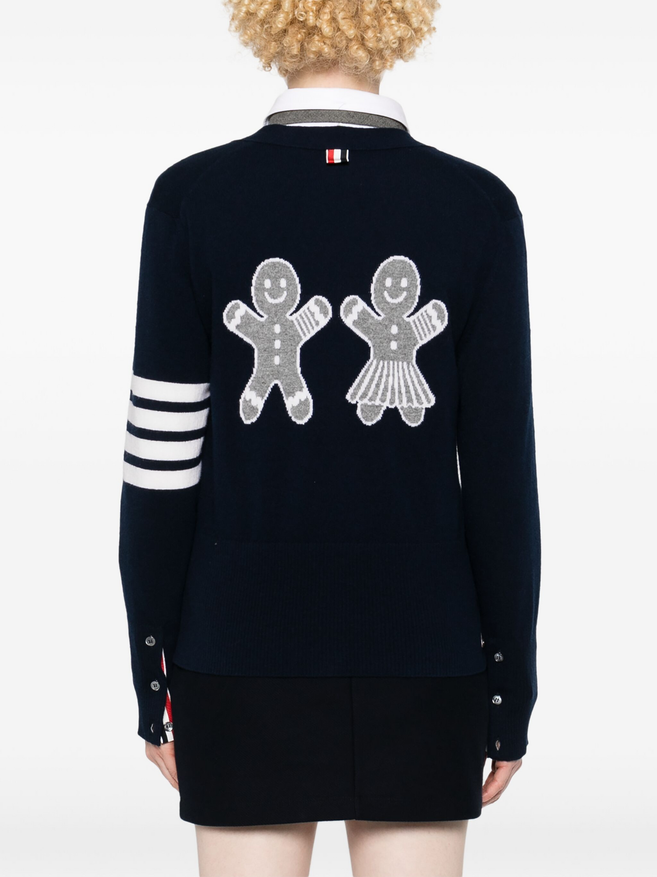 Our Mr. & Mrs. Gingerbread Merino Wool 4-Bar V-Neck Cardigan in rich navy. This silhouette exudes Thom Browne's mastery of minimalistic design and tailored excellence. A front button closure is at center, while two festive gingerbread rest at back.