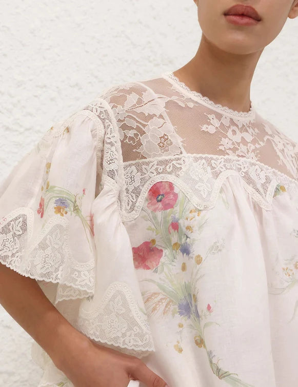 The Lucky Lace Trim Mini Dress in Cream Bouquet Floral from our Summer Swim 2025 Collection. A linen mini dress featuring a rounded neckline, ruffled wide sleeves, finished with a scalloped hem.