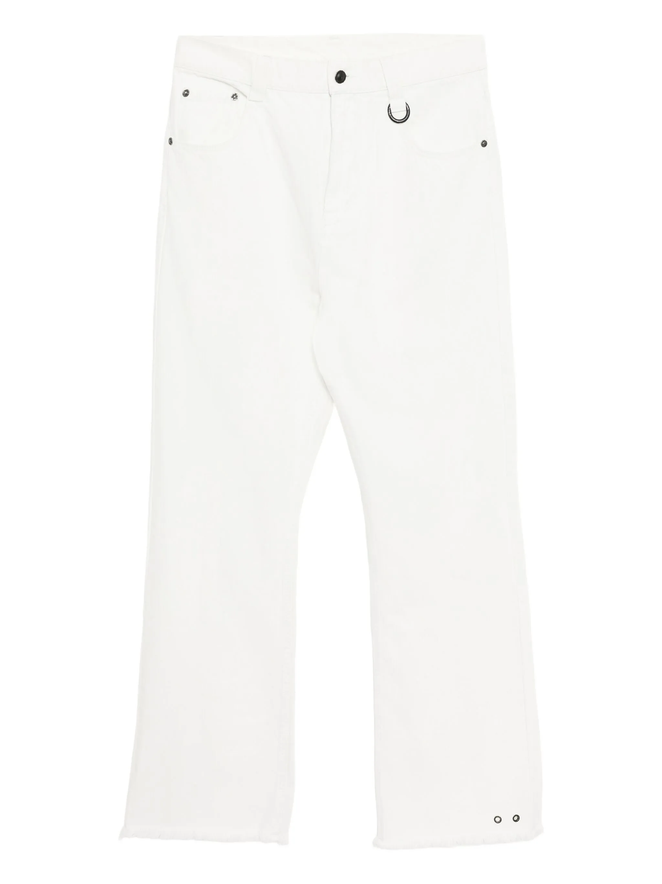 TEAM WANG design Acceptance Flare Jeans deliver contemporary streetwear with a vintage-inspired silhouette and modern construction. Crafted from premium white denim with a relaxed fit through the hips and dramatic flare from the knee down. The clean aesthetic and signature TEAM WANG design elements create a statement piece for elevated casual styling.