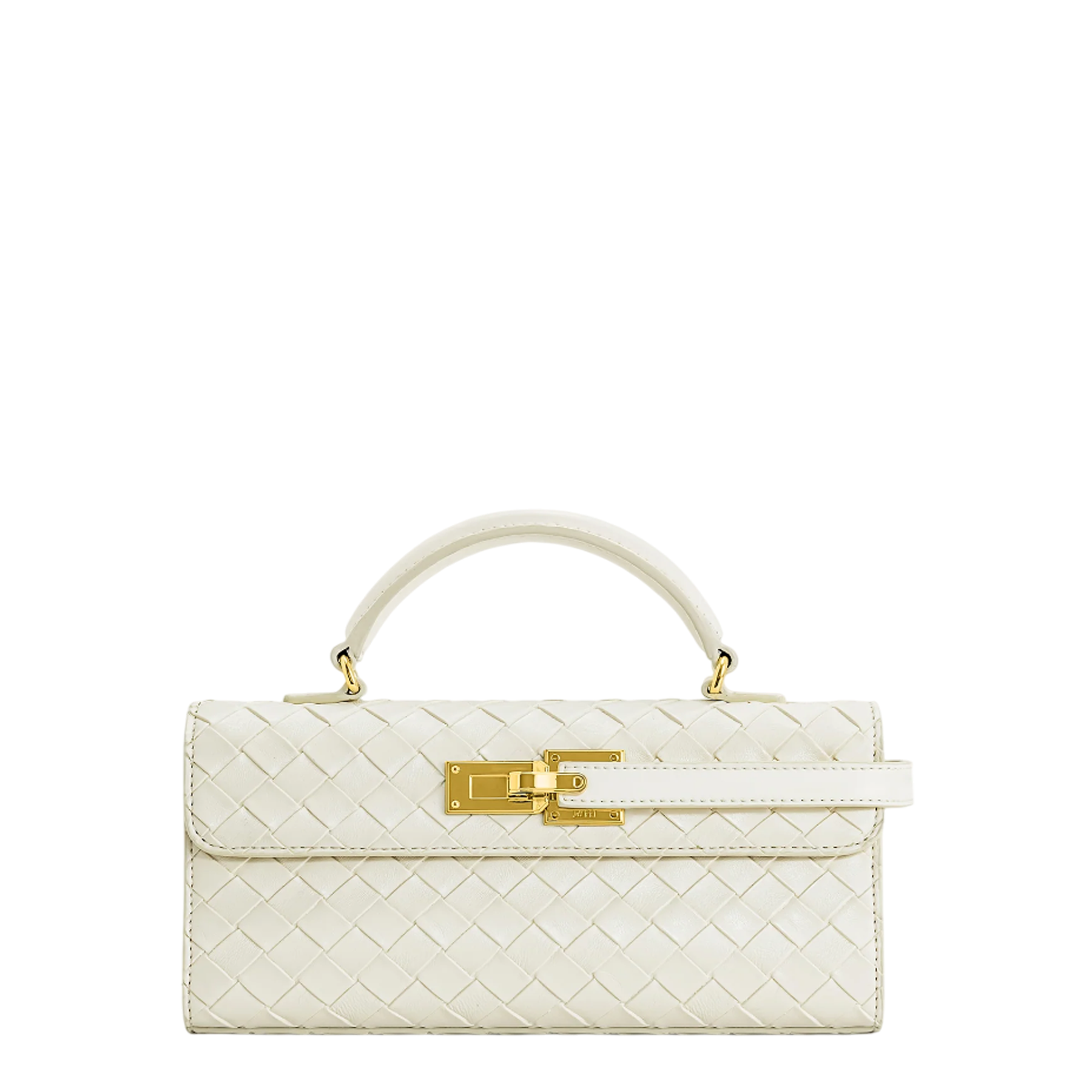 The JW PEI Keyla Weave Texture Top Handle delivers sophisticated elegance with artisanal basketweave craftsmanship. Crafted from premium woven leather in pristine ivory, featuring structured construction and polished gold hardware accents. The compact silhouette and signature intrecciato-inspired weaving technique create a timeless accessory for elevated styling.