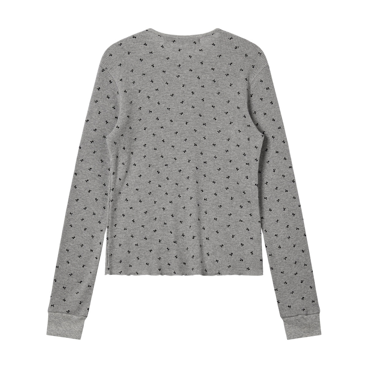 The Rest&Recreation Logo Pattern Waffle Top delivers contemporary comfort with distinctive textural detail. Crafted from premium waffle-knit cotton in sophisticated heather gray, featuring an all-over micro logo pattern for subtle brand recognition. The ribbed collar and cuffs create a refined casual silhouette perfect for elevated everyday styling.