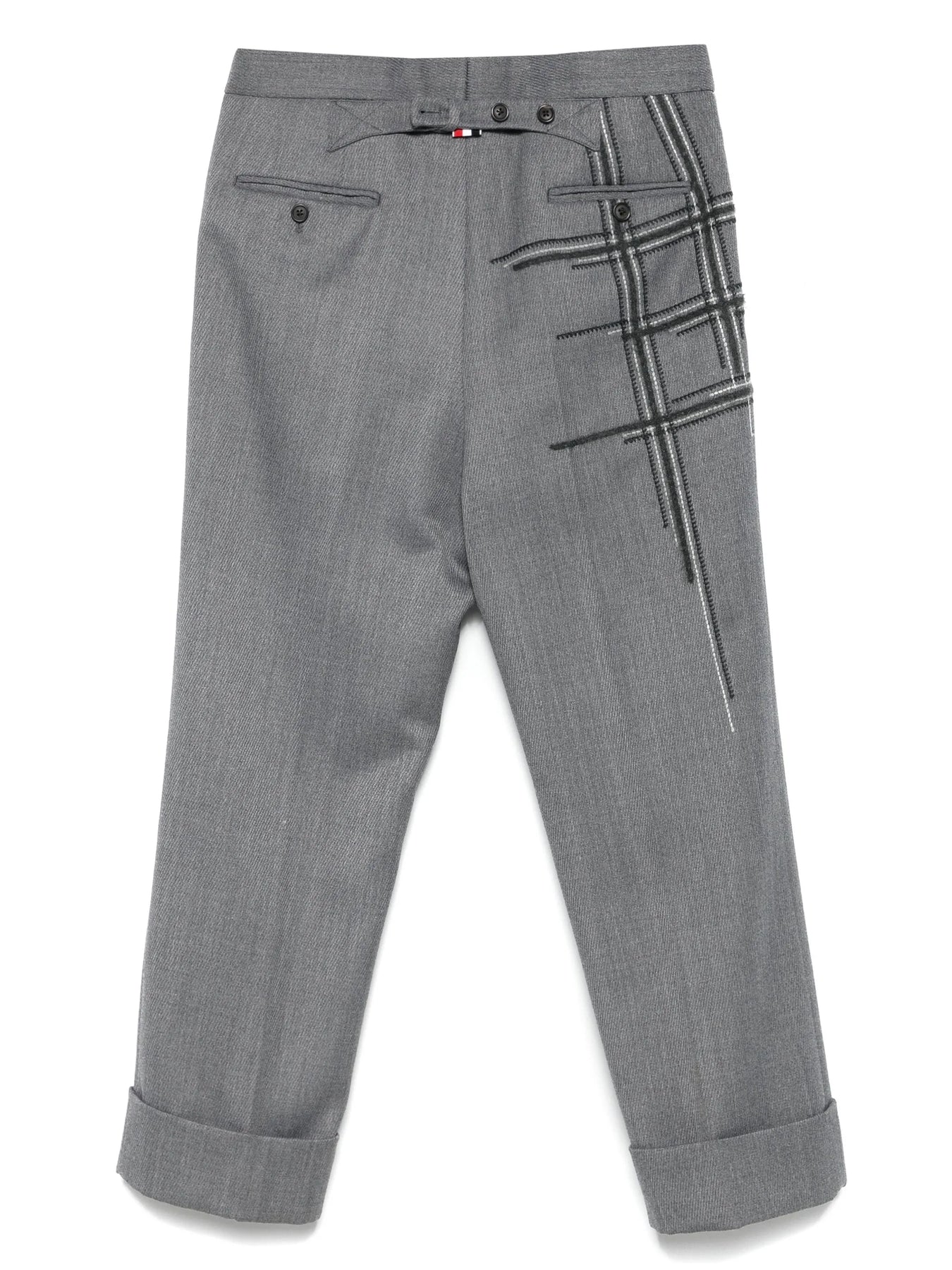 The Thom Browne Low Rise Wool School Uniform Trouser delivers preppy sophistication with signature academic-inspired tailoring. Crafted from premium wool suiting in refined grey, featuring distinctive check embroidery details and precise construction throughout. The low-rise silhouette and signature Thom Browne uniform aesthetic create a modern interpretation of classic scholastic style.