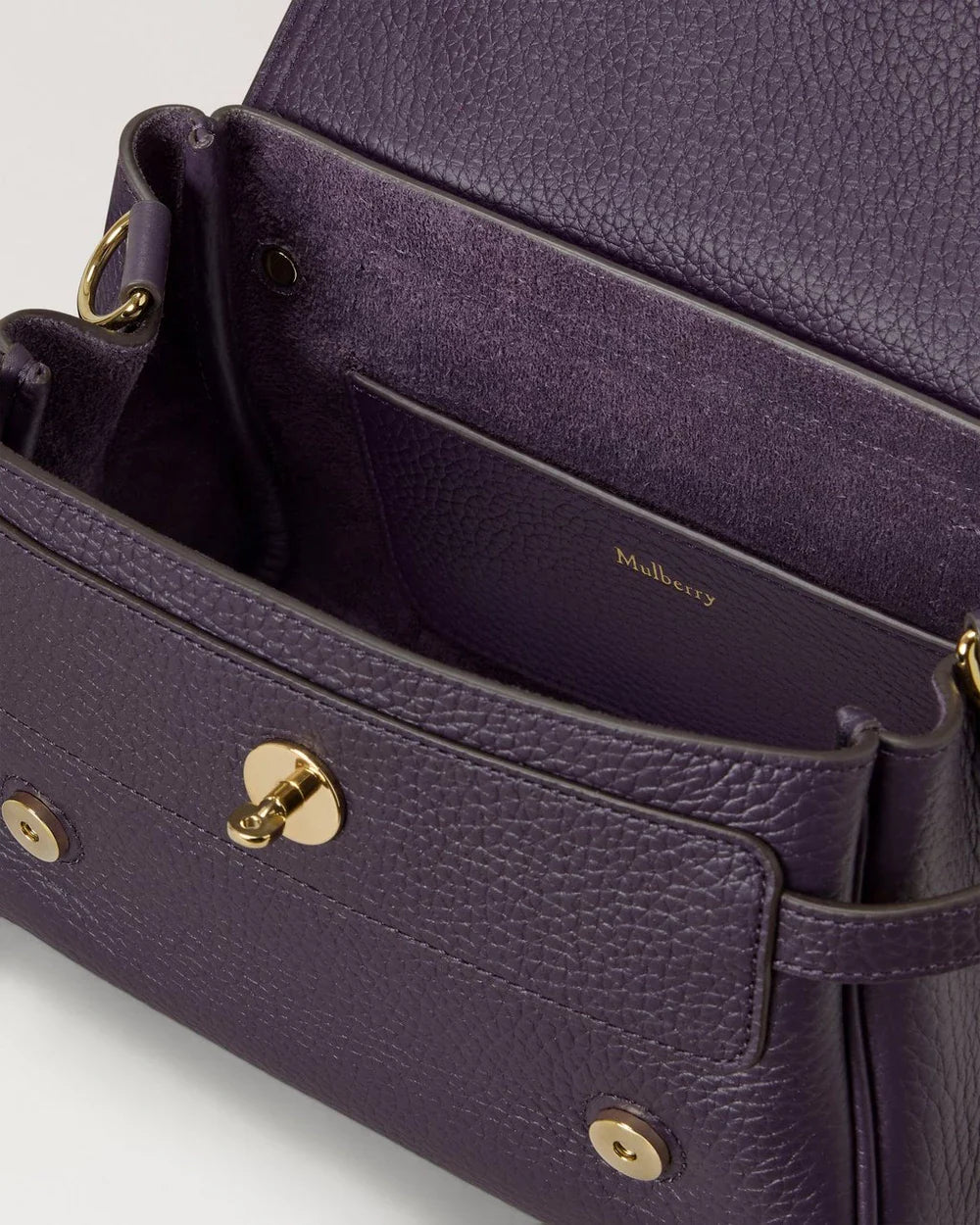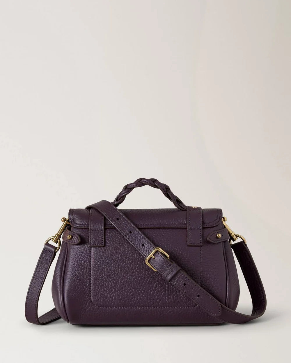 The Mulberry Mini Alexa Heavy Grain delivers iconic British craftsmanship in a compact, versatile silhouette. Crafted from signature heavy grain leather in deep purple with antique brass hardware, featuring the brand's signature postman's lock closure. The structured design and premium leather construction create a timeless investment piece that transitions seamlessly from day to evening.