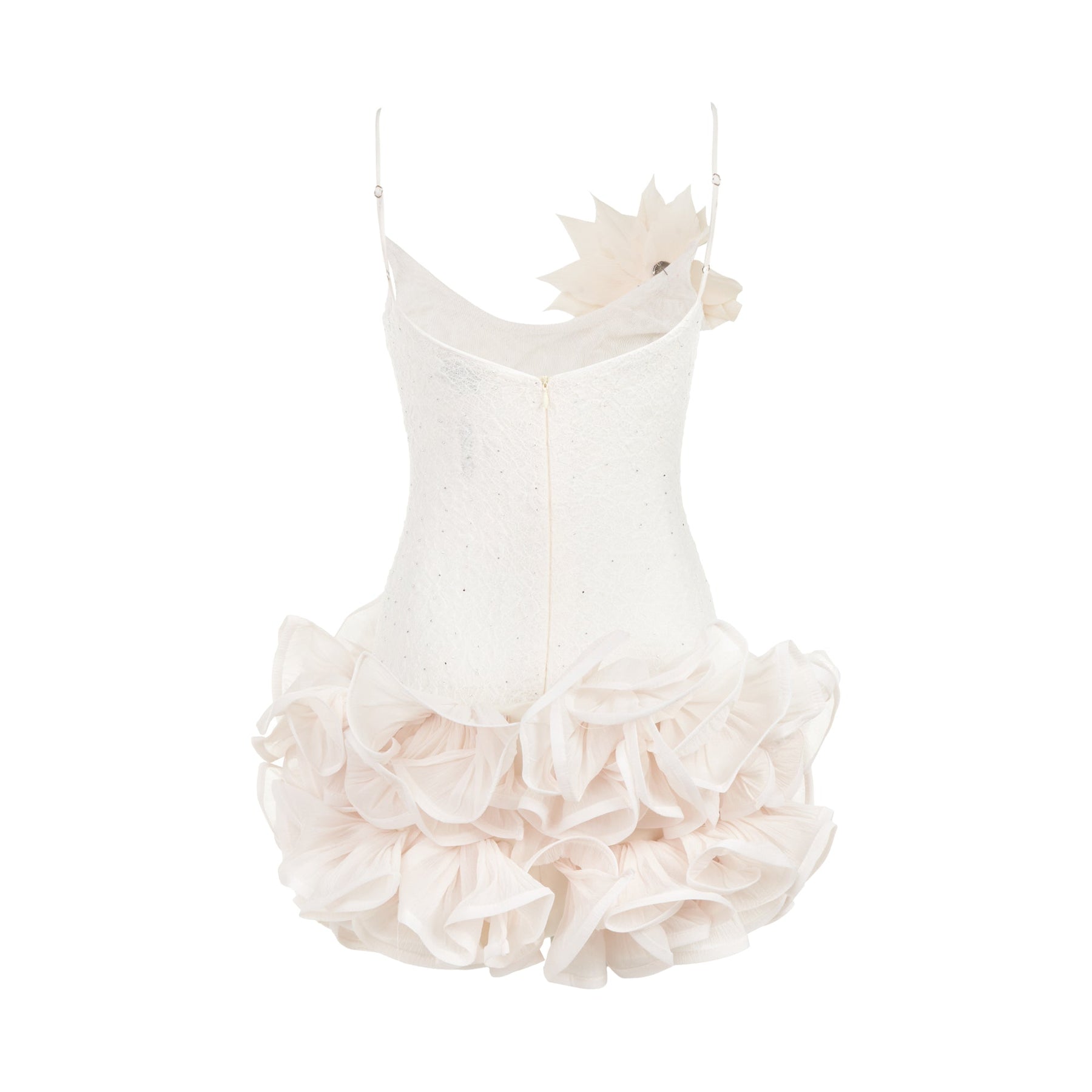 The Kenzie Klambie Ruffle Dress delivers feminine elegance with sophisticated party-ready styling. Crafted from sparkle-embellished fabric in pristine white, featuring dramatic ruffled tiers and floral appliqué detailing. The fitted bodice with spaghetti straps creates a flattering silhouette perfect for special occasions.