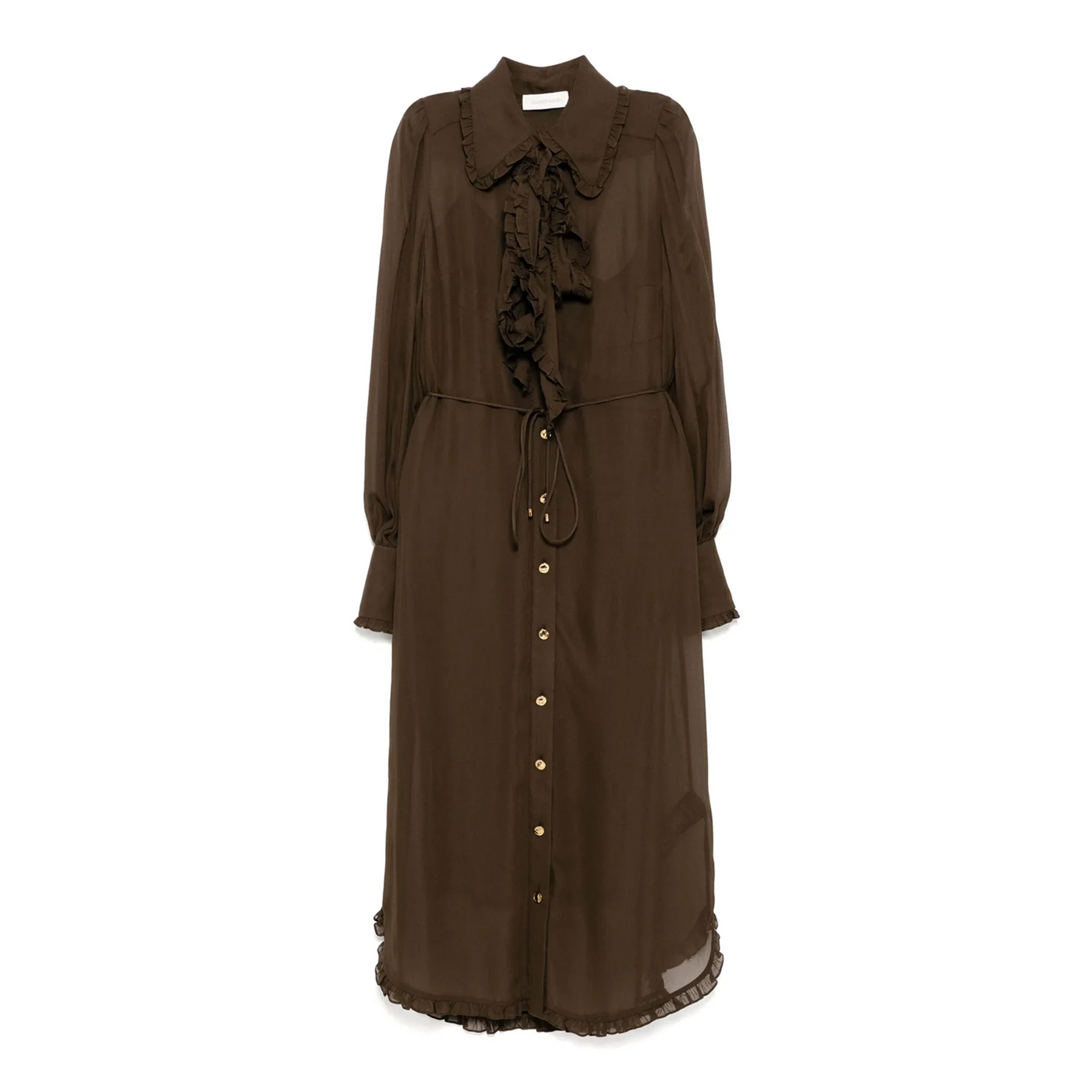 ZIMMERMANN Ruffle Midi Dress delivers feminine elegance with bohemian sophistication and romantic detailing. Crafted from lightweight silk chiffon in rich chocolate brown, featuring cascading ruffles and a flattering midi-length silhouette. The pussy bow neckline and button-through front showcase the brand's signature romantic aesthetic with contemporary wearability.