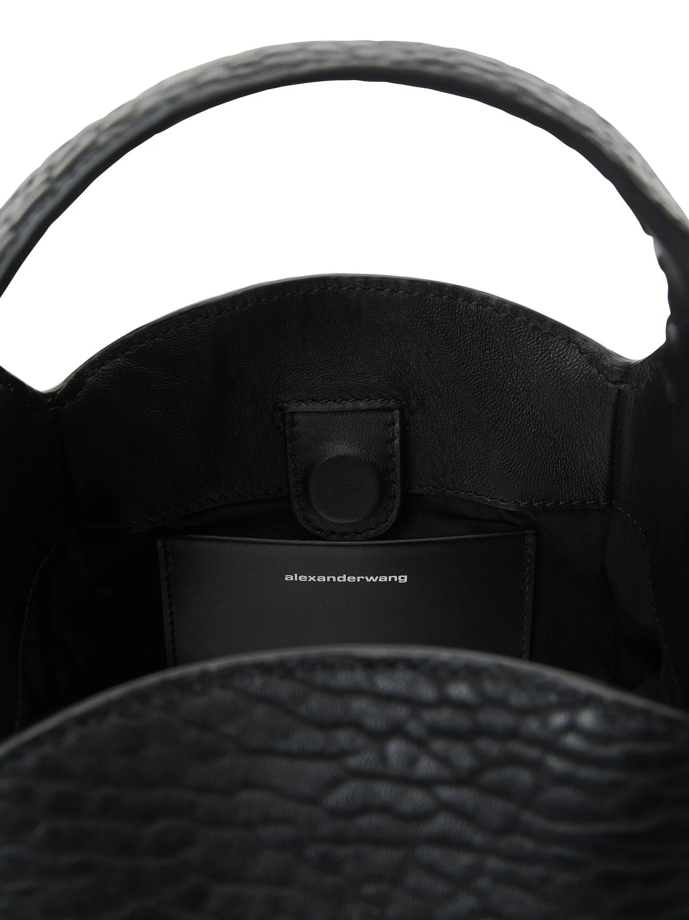 Trap studs define this pyramid-shaped rex mini bucket bag in black. a fixed top handle and removable strap with a logo-rolled adjusted buckle allows for maximum versatility.