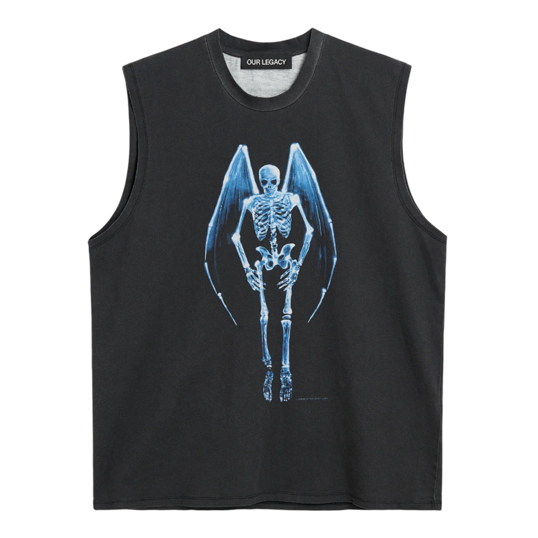 The Our Legacy Breathe Tank delivers contemporary streetwear with striking gothic graphic design and comfortable sleeveless construction. Crafted from soft cotton jersey in charcoal with luminous blue skeletal angel print that creates a bold statement piece. The relaxed sleeveless silhouette and signature Our Legacy aesthetic elevate casual wardrobes with edgy Scandinavian design.